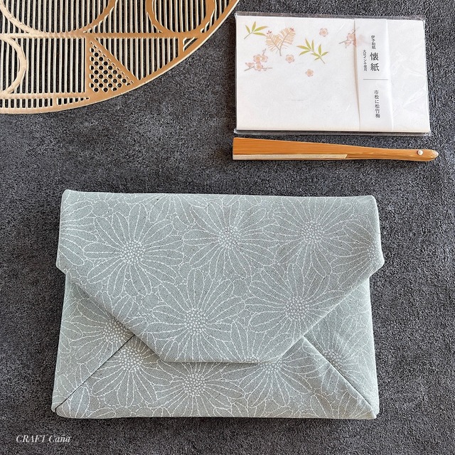 Yuwaのミュールズコレクション生地でおつくりした、コットンの洋風数寄屋袋です。エレガントで彩のあるボタニカルフラワー模様。 「数寄屋袋」とはそもそも、お茶席で使う懐紙や扇子などの小物をまとめて入れておく封筒型ポーチのことです。 当ショップの数寄屋袋は、茶道、華道、香道などのお道具入れとしてはもちろん、御朱印帳入れ、日常使いのポーチ、バッグインバッグとしてもお使いいただけます。 サイズ 横21㎝×縦15㎝×マチ1㎝(若干の誤差あります) マグネットホックでの開閉 御朱印帳であれば2冊入ります 中にネル生地を挟んであり、全体的に柔らかな手触りです。蓋部分に固い厚紙は入れておりませんが、接着芯が入っています。 市販品にはないかわいさを求めて、 CRAFTカーニャにて生地をお選びし組み合わせを考えたオリジナルな数寄屋袋です。ハンドメイドという点をご理解いただき、ご購入ください。 *以下のオプションがあります。オプションはご注文をいただいてから作成しています。 古帛紗 2000円 *他サイトでも販売しておりますため、急な欠品や出品取り消しもございます。ご了承ください。 *サイズ変更などのオーダーは受けておりません。 *再出品依頼やおまとめなど個別対応で専用ページになる場合、出品後5日以内にはご購入をお願いします。それ以上延びたら専用をはずして販売します。