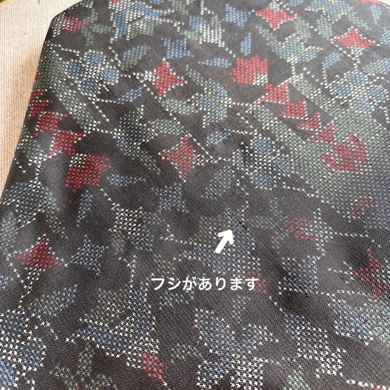黒地に咲く赤・青・緑の幾何学的な花模様は、どこかモダンで可憐な印象。