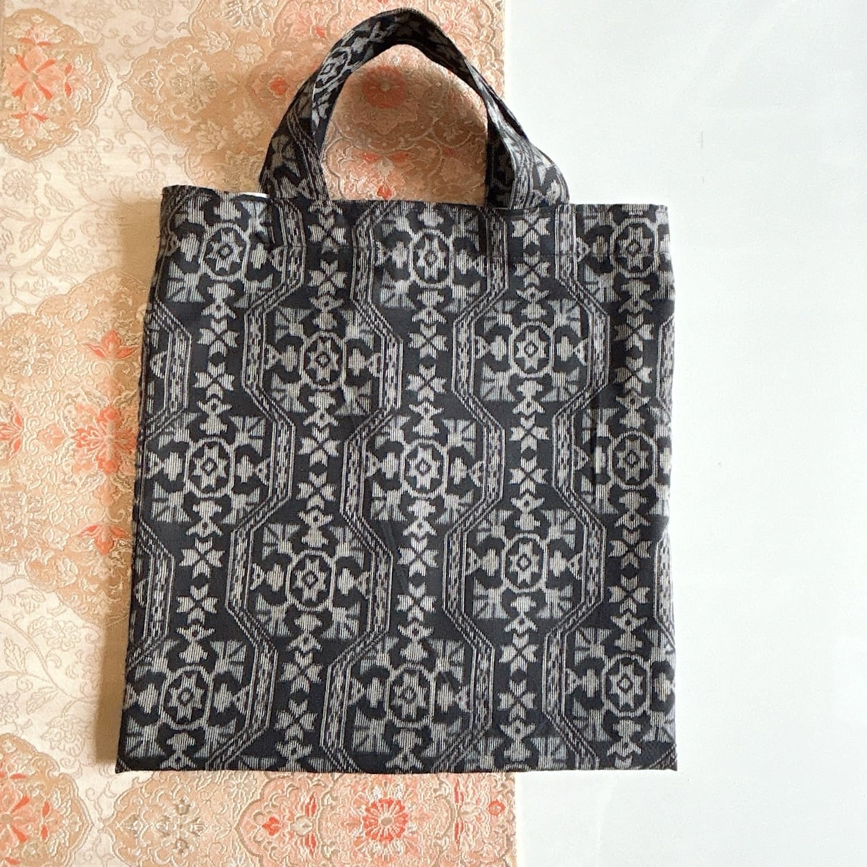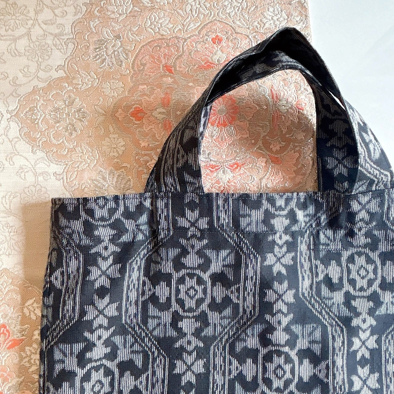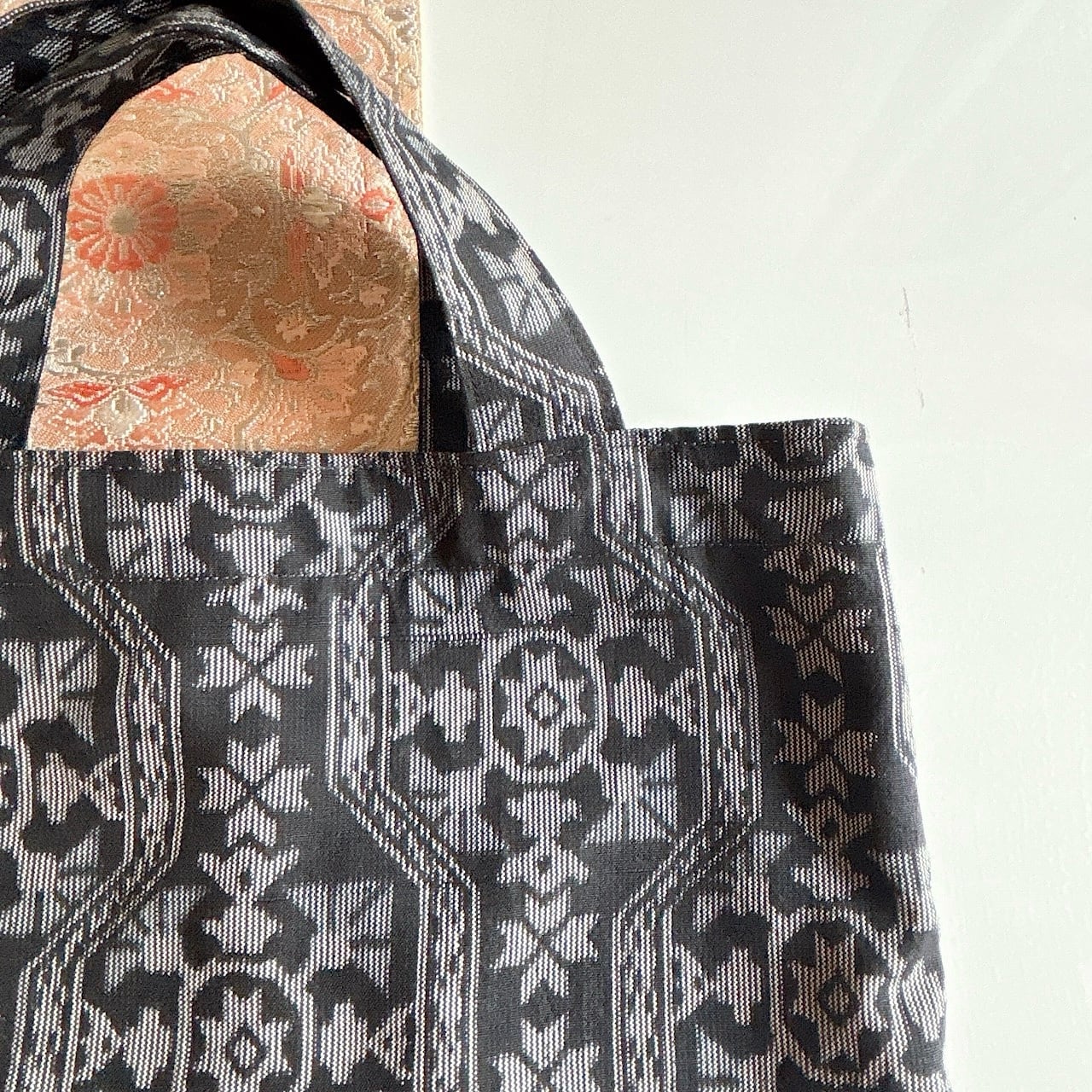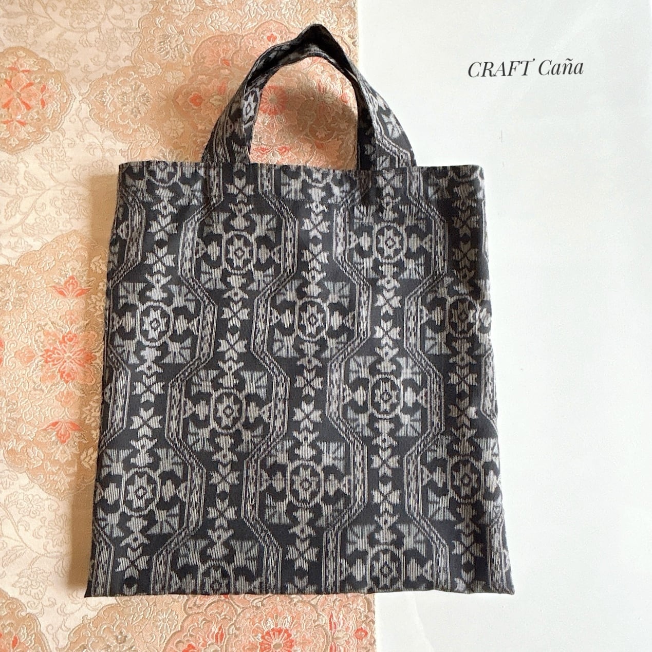 ケルト文化を思わせる幾何学文様が映える着物リメイクのマチなしトートです。