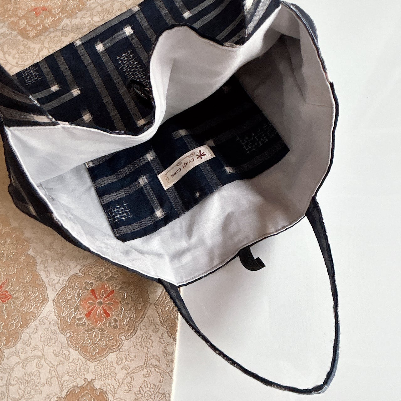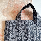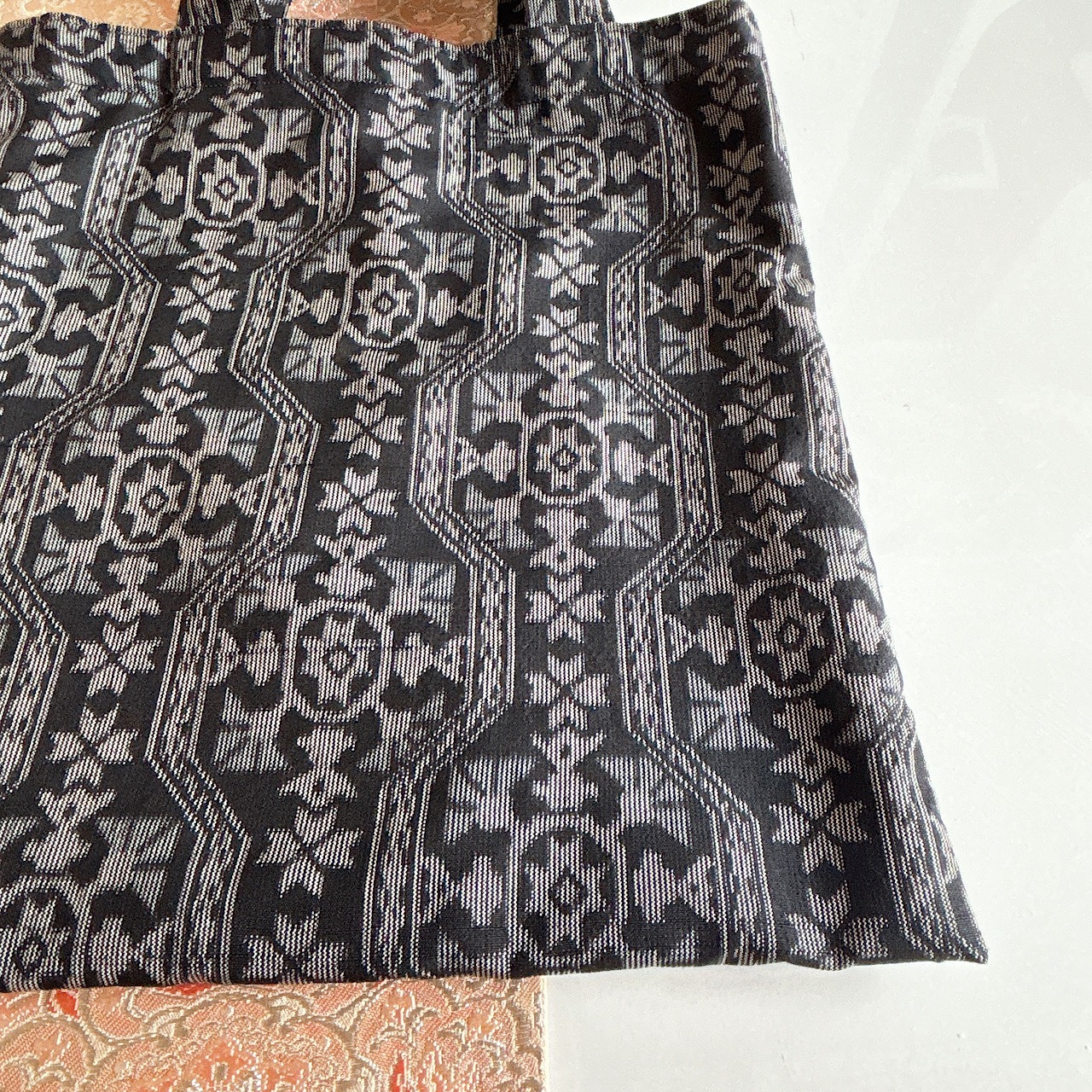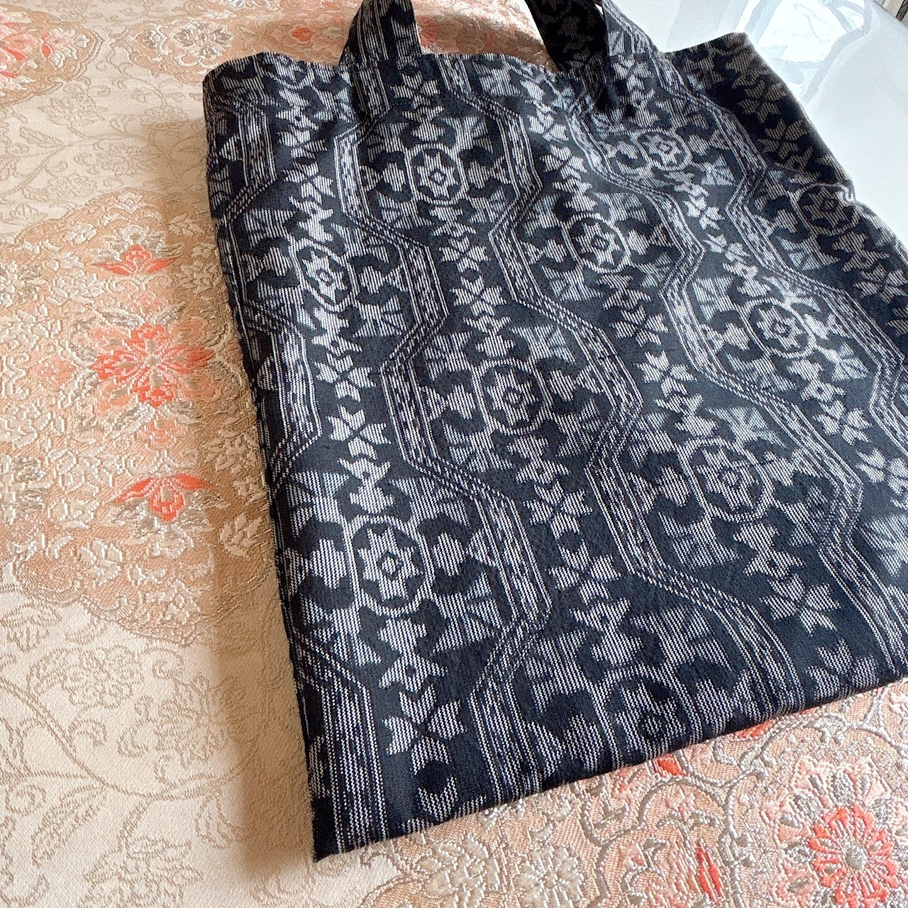 ケルト文化を思わせる幾何学文様が映える着物リメイクのマチなしトートです。