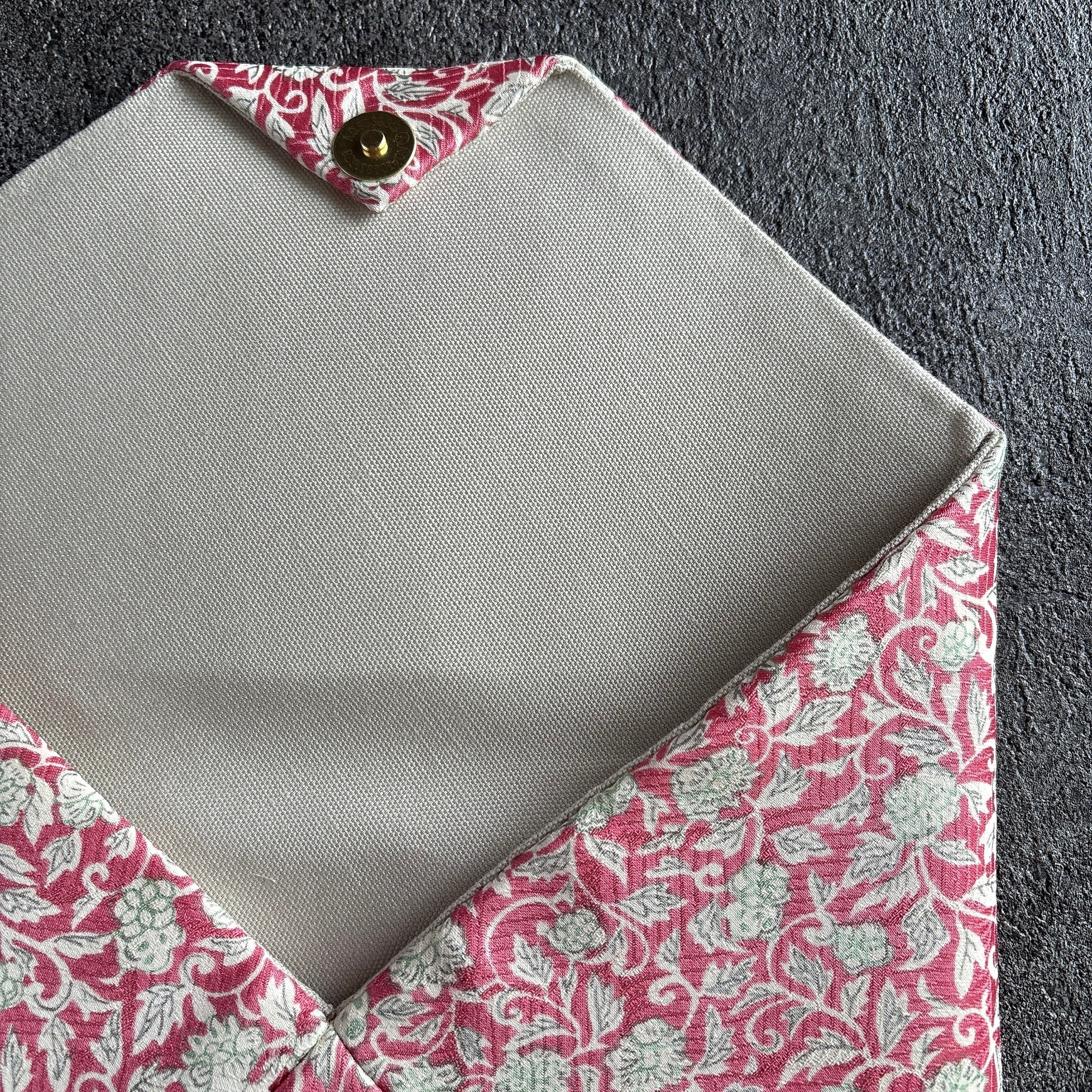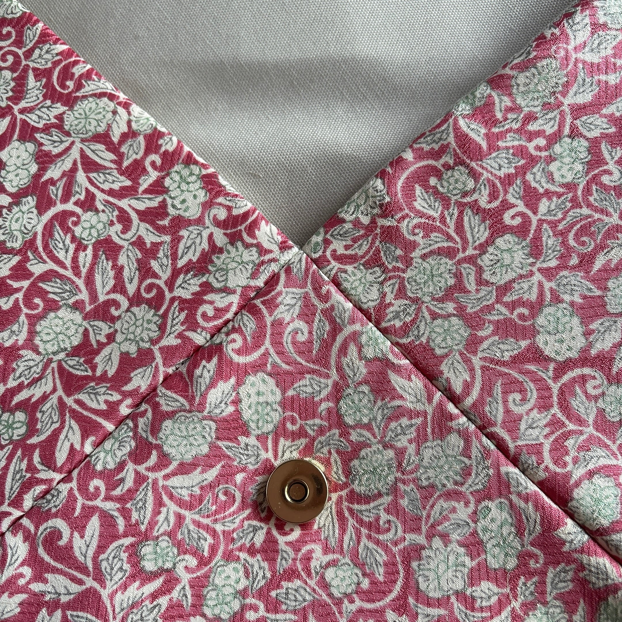 リサイクル着物(綸子のような地模様と光沢も若干あり)からおつくりした数寄屋袋です。濃いめピンクにグレー系の唐花模様で、甘すぎないかわいさ。