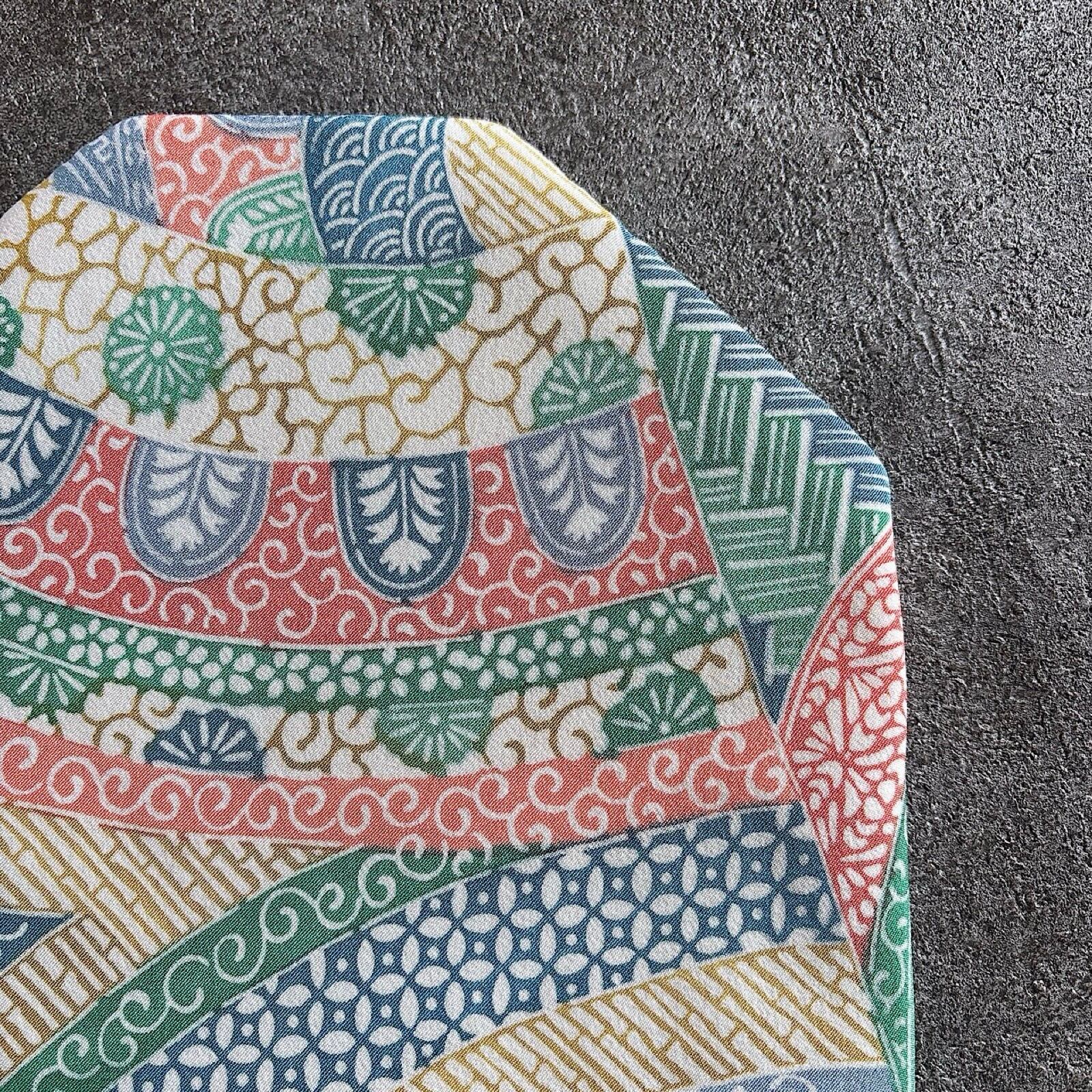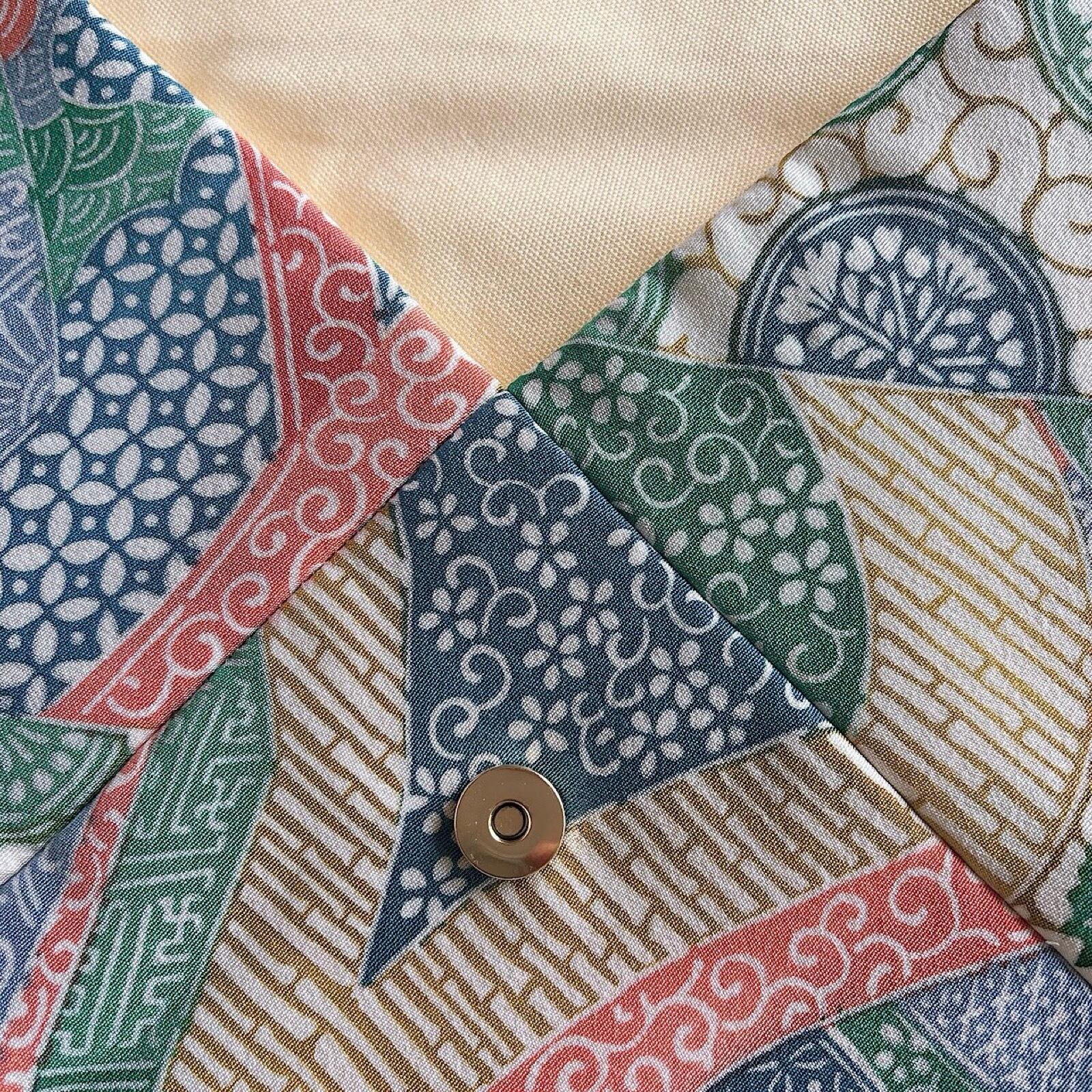 リサイクル着物からおつくりした数寄屋袋です。良く見ると青海波、七宝、唐草、竹などの伝統柄が切嵌(パッチワークみたいに)になっていて、どこかイスラムチックな雰囲気もあり、ちょっと珍しいお着物でした。裏地はコットン生地のペールイエローをあわせ、爽やかに仕上がっています。