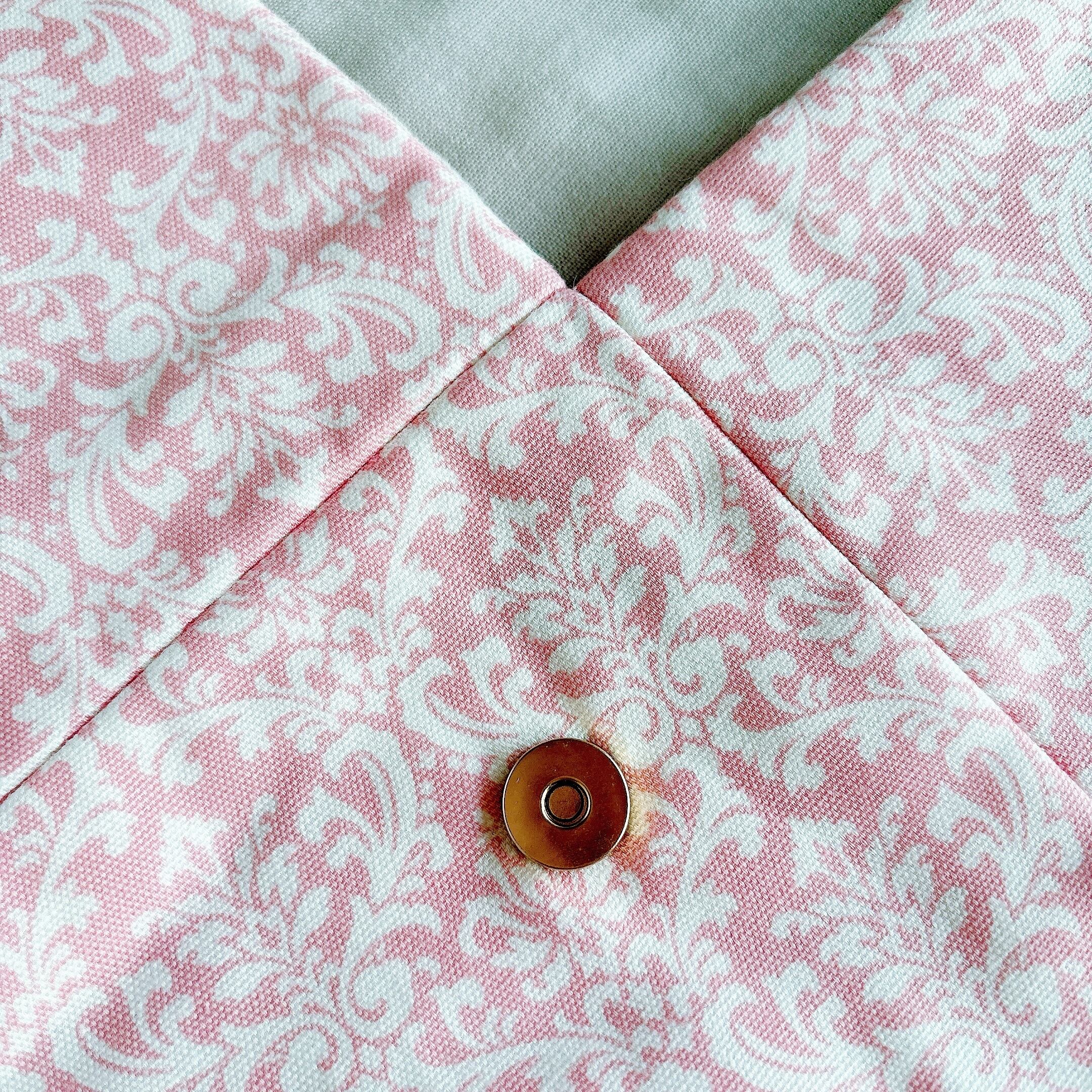 ピンク×白のダマスク模様に、裏地は生成りのリネンをあわせました。エレガントだけどかわいさもあり。黒、ネイビー、グレーなど、ベーシックなスーツで持ってもお似合いになると思います。