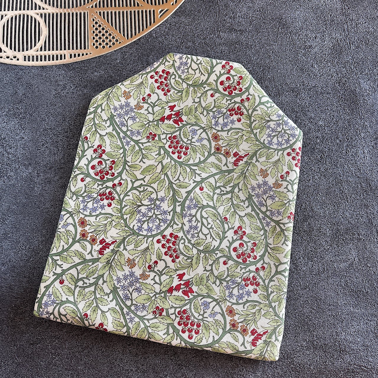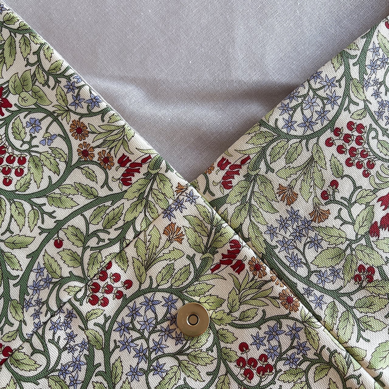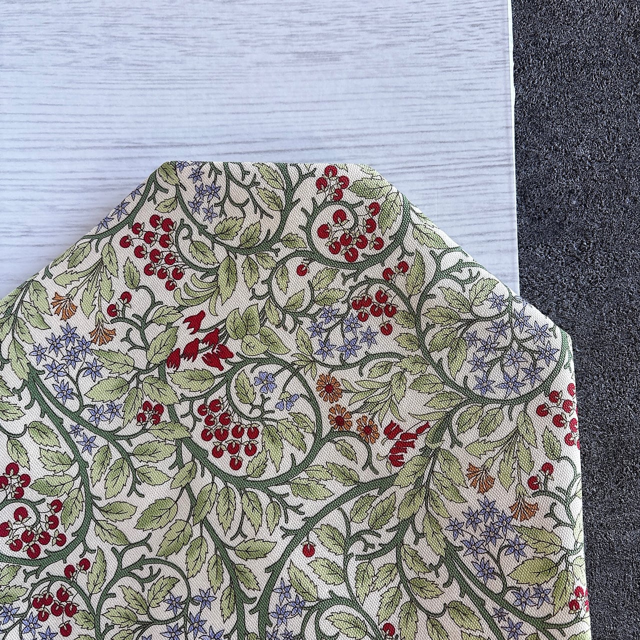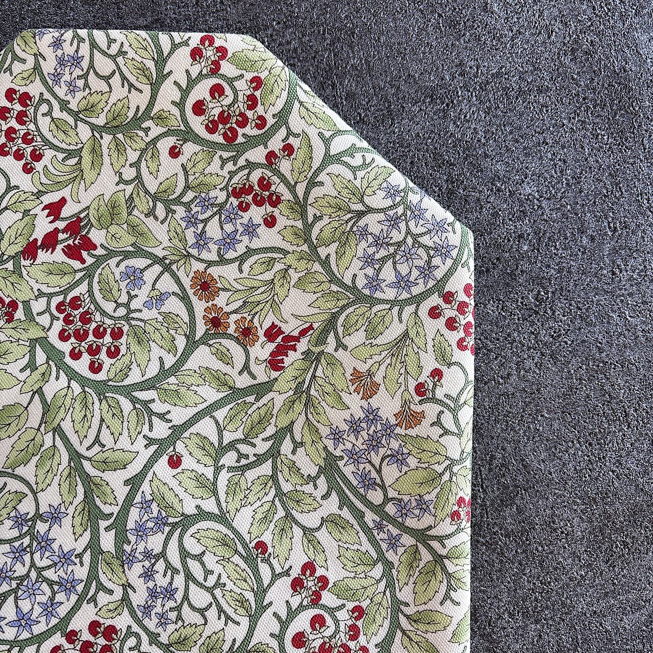 やわらかなグリーンの蔦模様に、赤い木の実やタンポポ、ブルースターのような花々が散りばめられた華やかなデザイン。