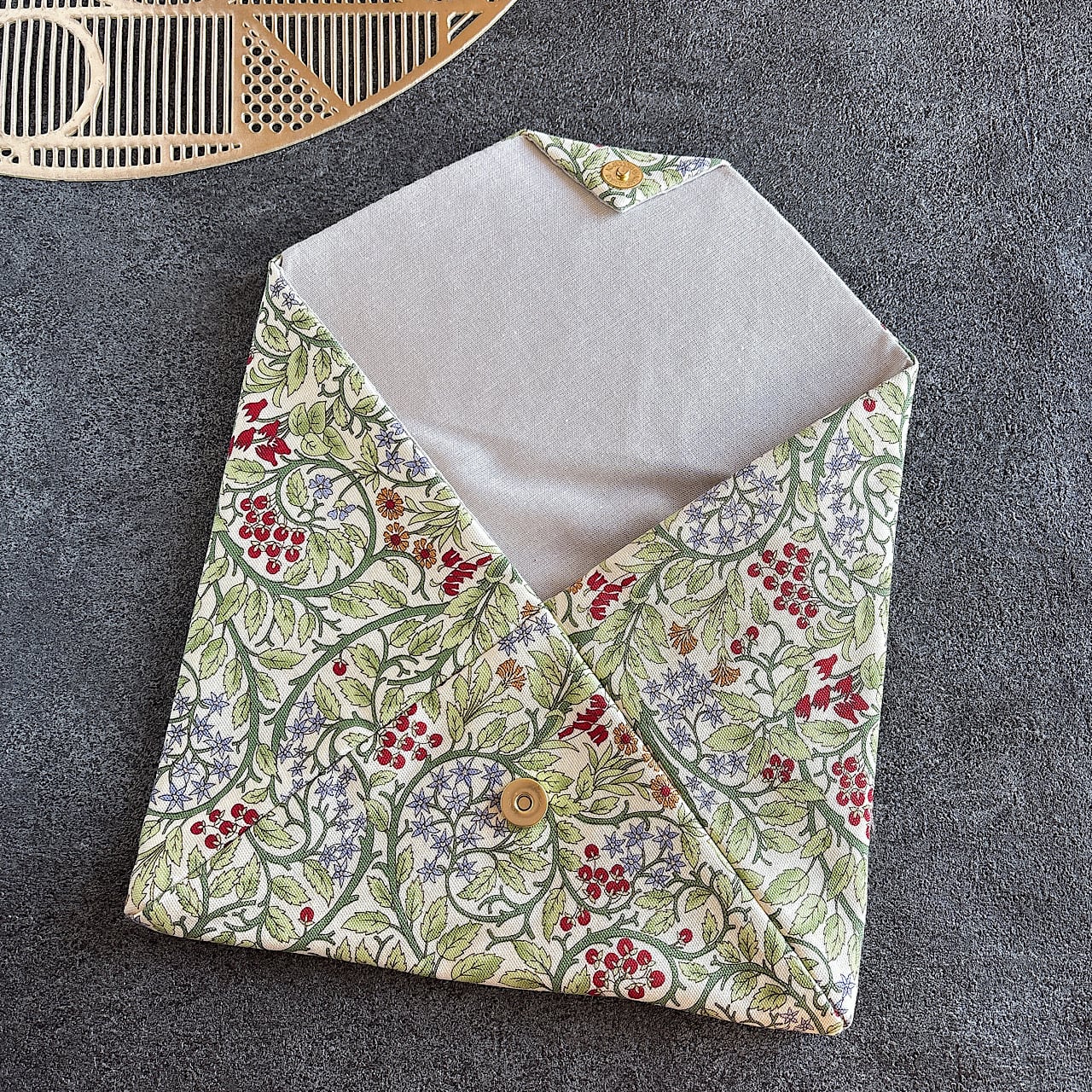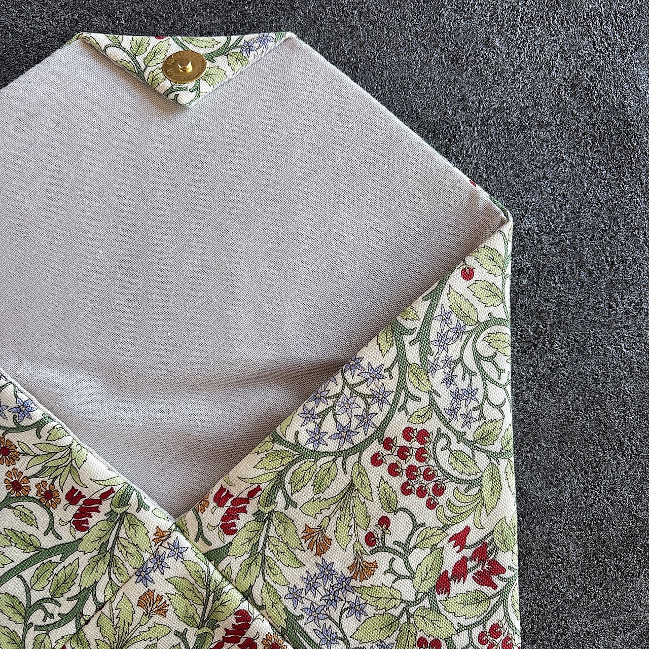裏地には生成り色のリネンを使用し、内側にはネル生地を挟むことでふんわりと柔らかな手触りに仕上げました。蓋部分には厚紙を使わず、適度な厚さの接着芯を施しているため、軽やかでありながらしっかりとした作りです。