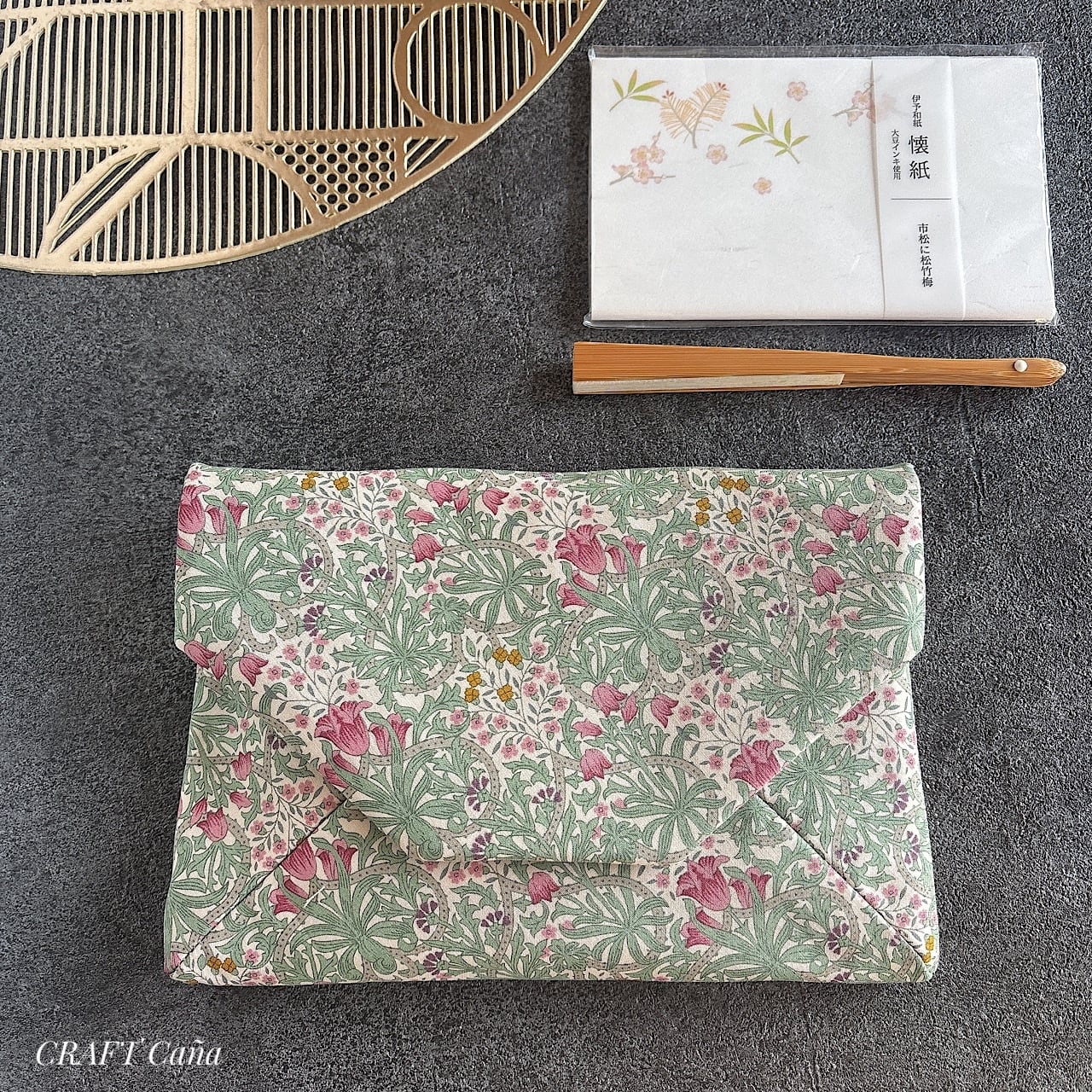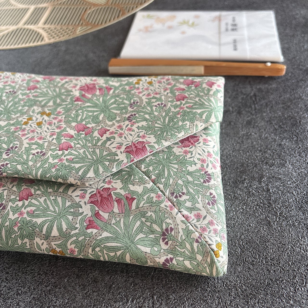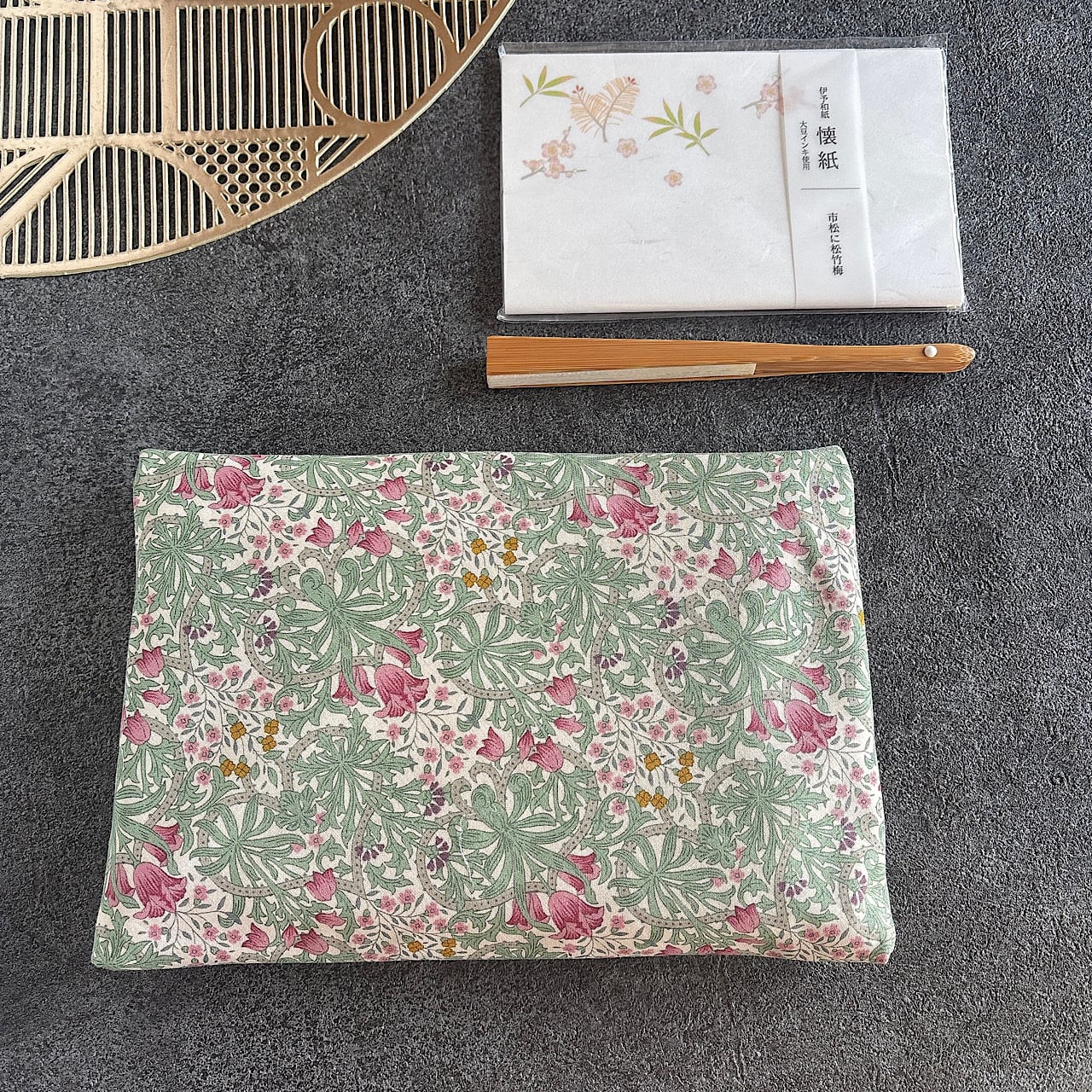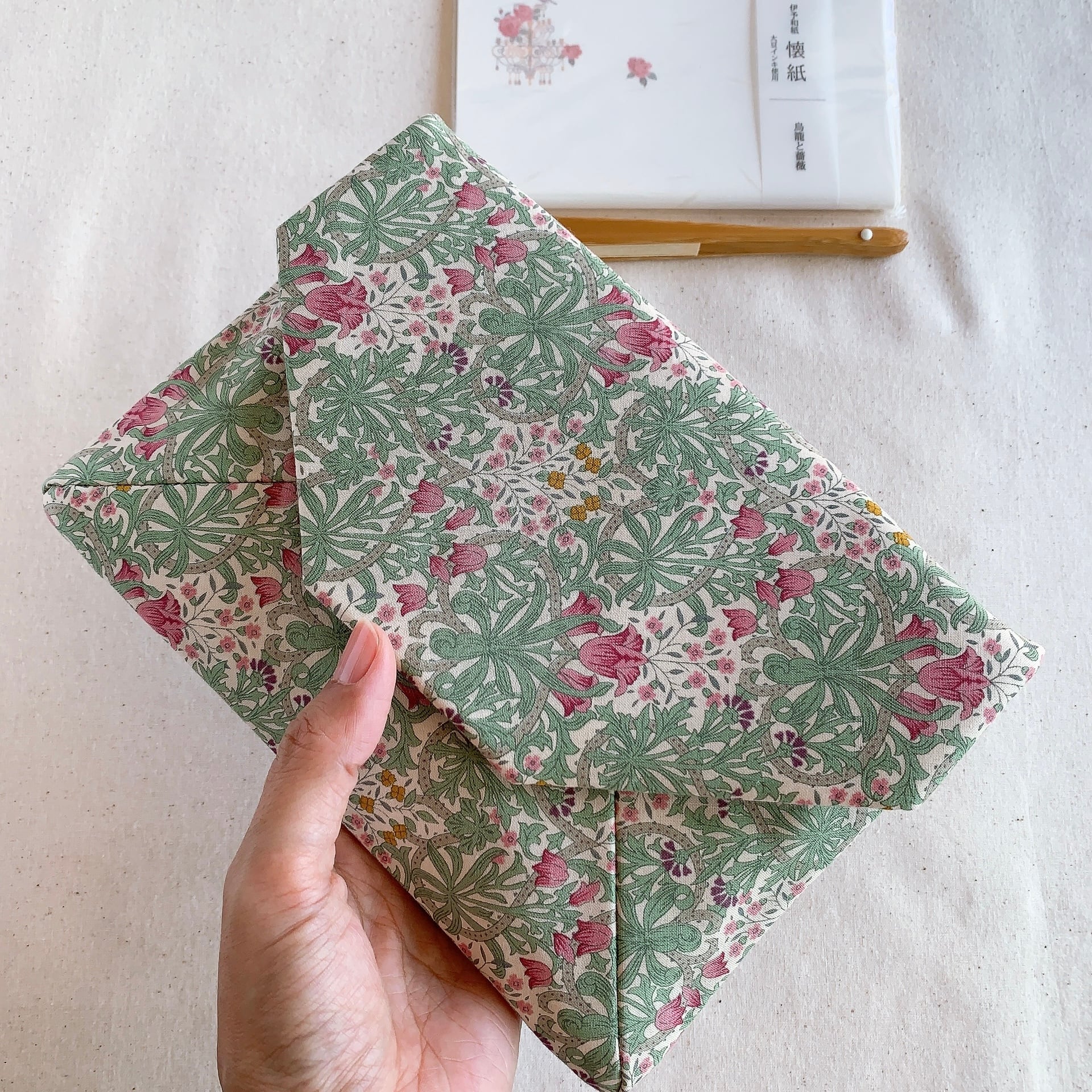 「数寄屋袋」とはそもそも、お茶席で使う懐紙や扇子などの小物をまとめて入れておく封筒型ポーチのことです。