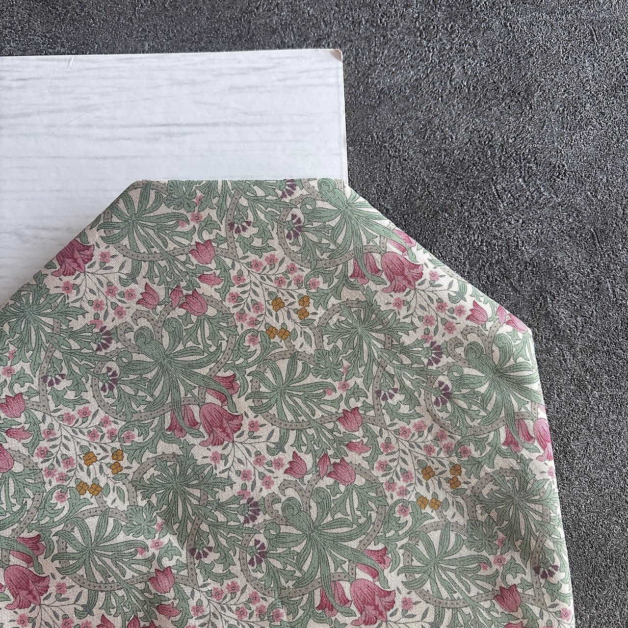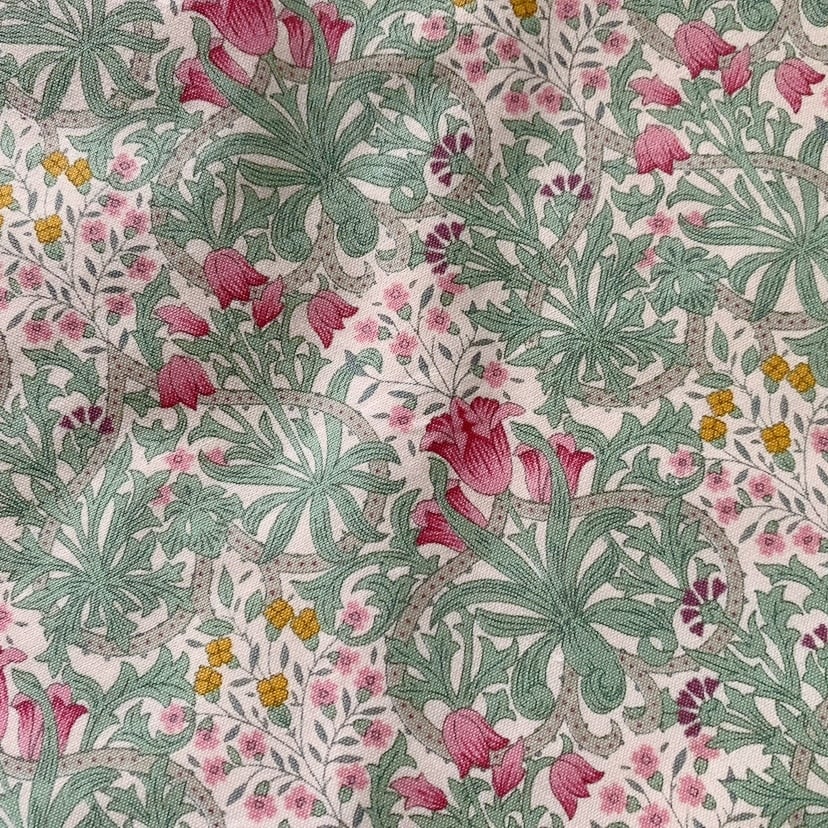 葉や茎が蔦のように流線で描かれ、その中に可愛らしい小花が咲いています。視点を変えると茎がハートに見えたり、落ち着いた色味ではありますが大人ガーリーなかわいい印象に仕上がっています。