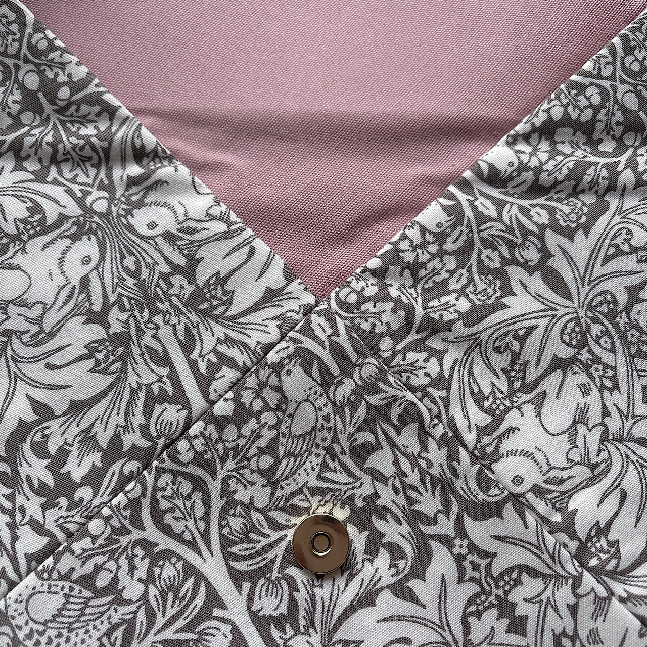 moda fabricsのWilliam Morrisデザインの生地「ブラザーラビット」を使用しておつくりした、洋風の数寄屋袋です。裏地はくすみピンクをあわせています。