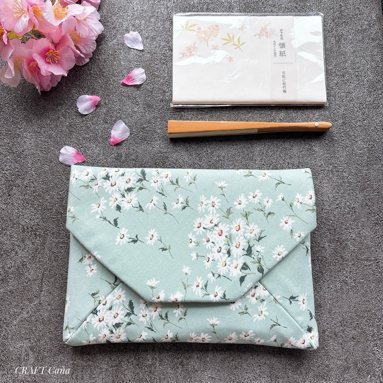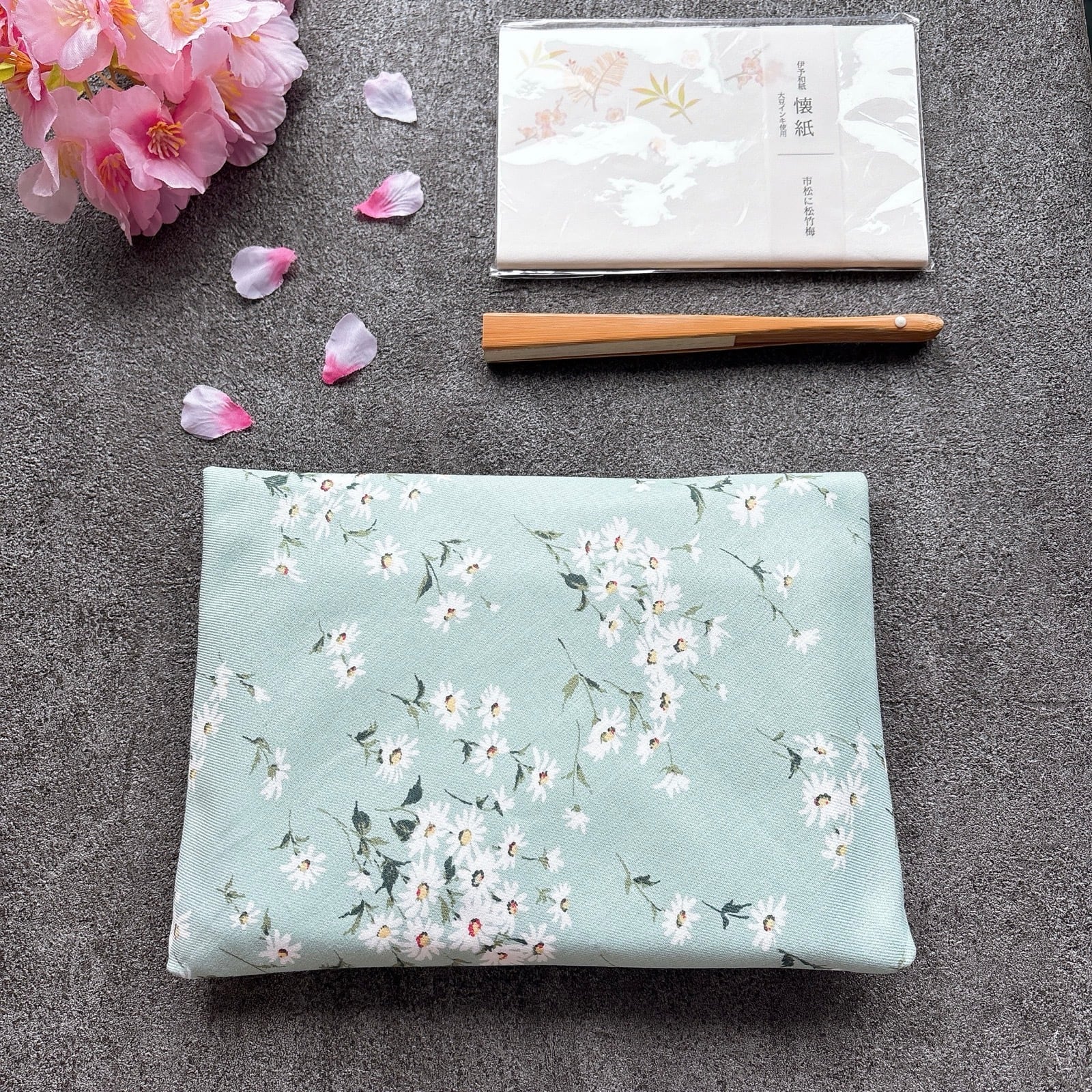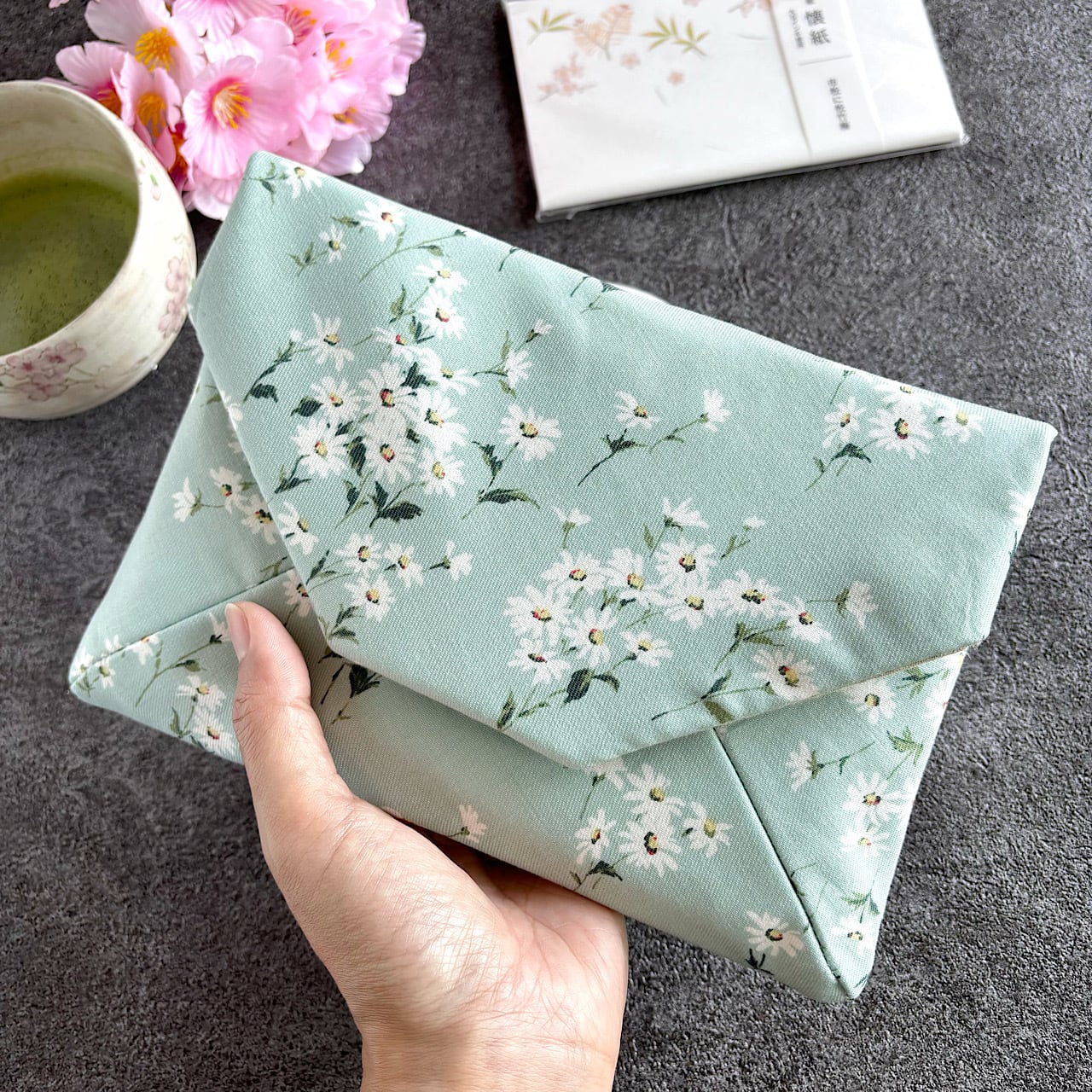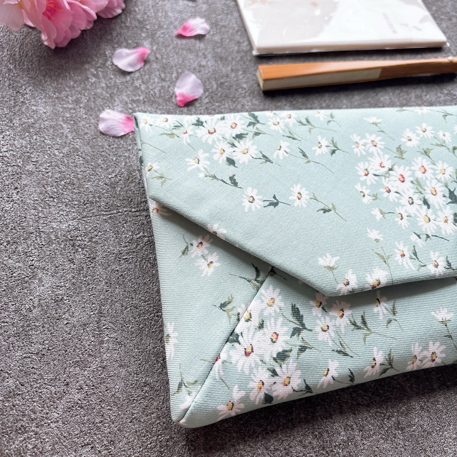 Yuwaのシャルマンコレクション生地でおつくりした、コットンの洋風数寄屋袋です。ミントカラーに白いマーガレットが可憐な印象。裏地は生成りをあわせました。主張しすぎない楚々としたかわいらしさです。