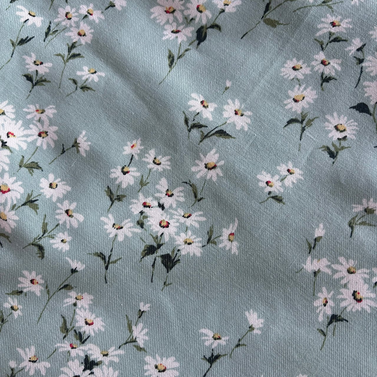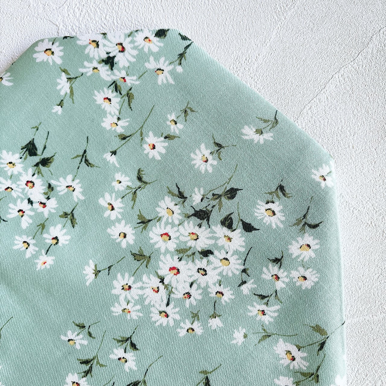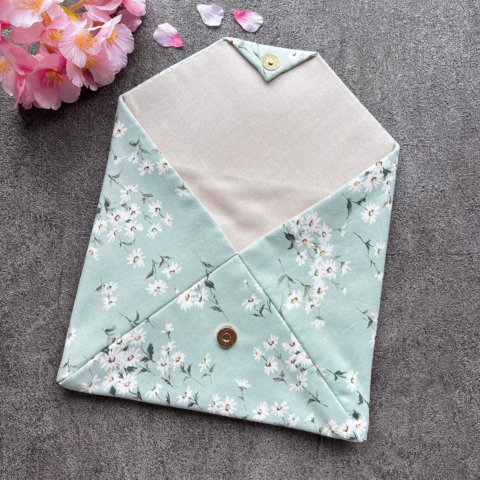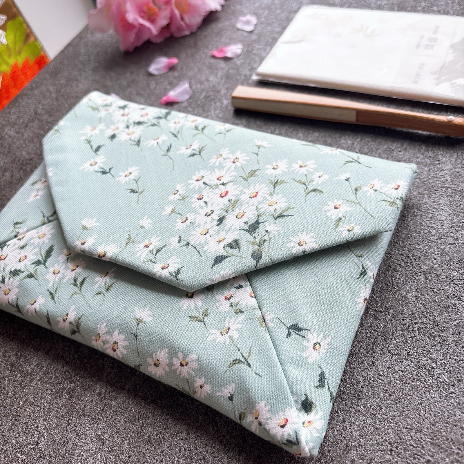 Yuwaのシャルマンコレクション生地でおつくりした、コットンの洋風数寄屋袋です。ミントカラーに白いマーガレットが可憐な印象。裏地は生成りをあわせました。主張しすぎない楚々としたかわいらしさです。