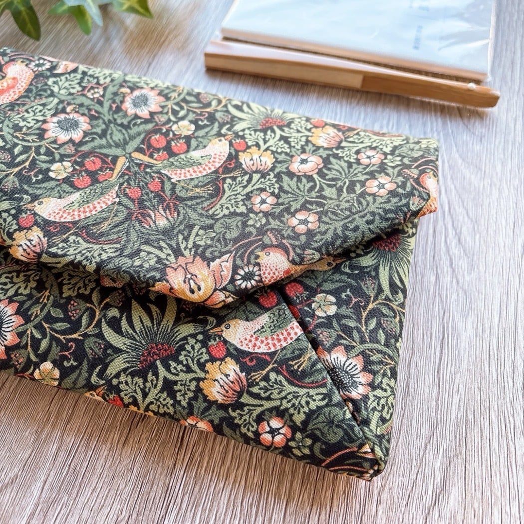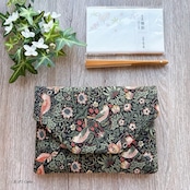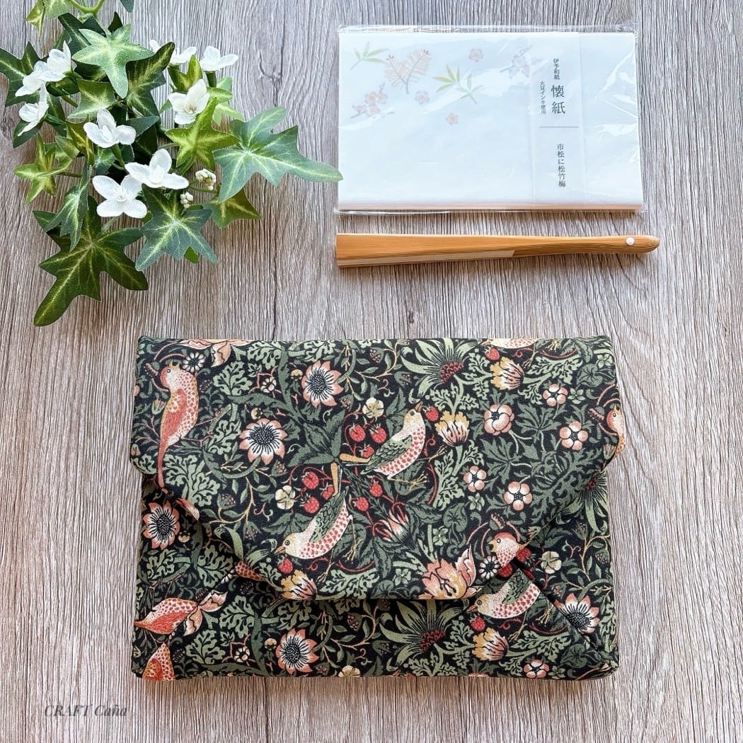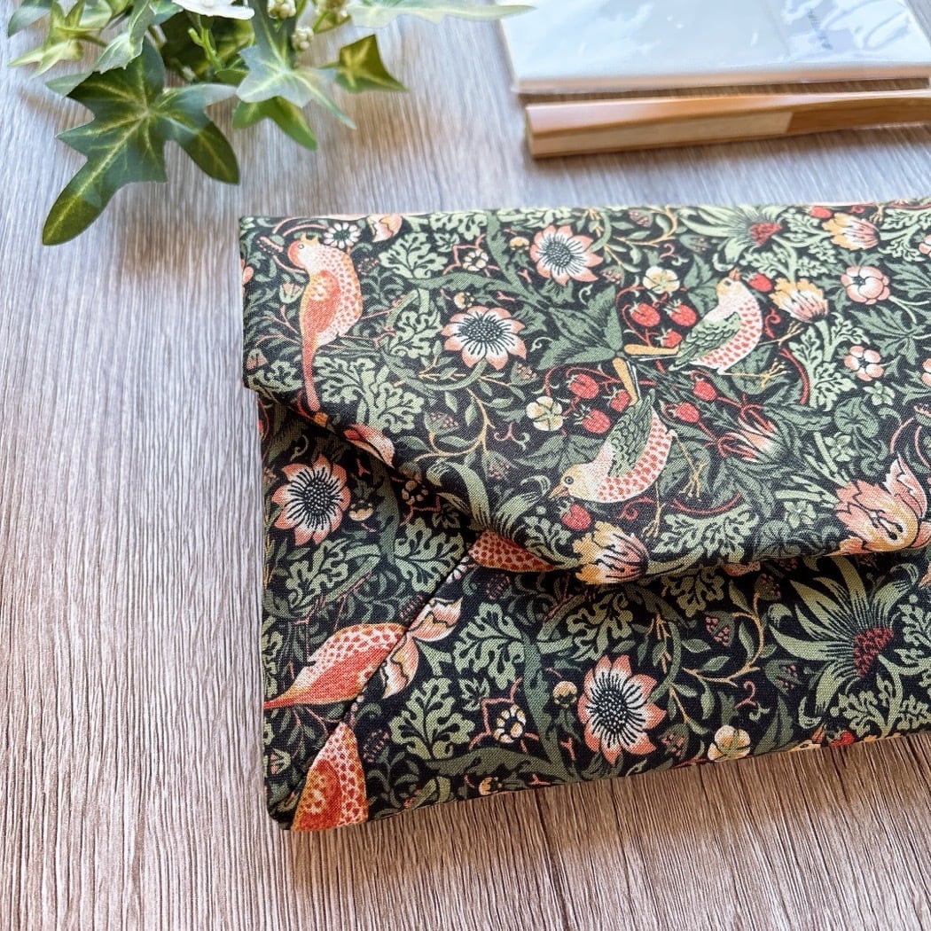 moda fabricsの「William Morris」デザイン生地「いちご泥棒」を使用し、苺をついばむ鳥が描かれた洋風の数寄屋袋に仕上げました。裏地には生成り色のリネンを合わせ、自然で落ち着いた風合いが特徴です。