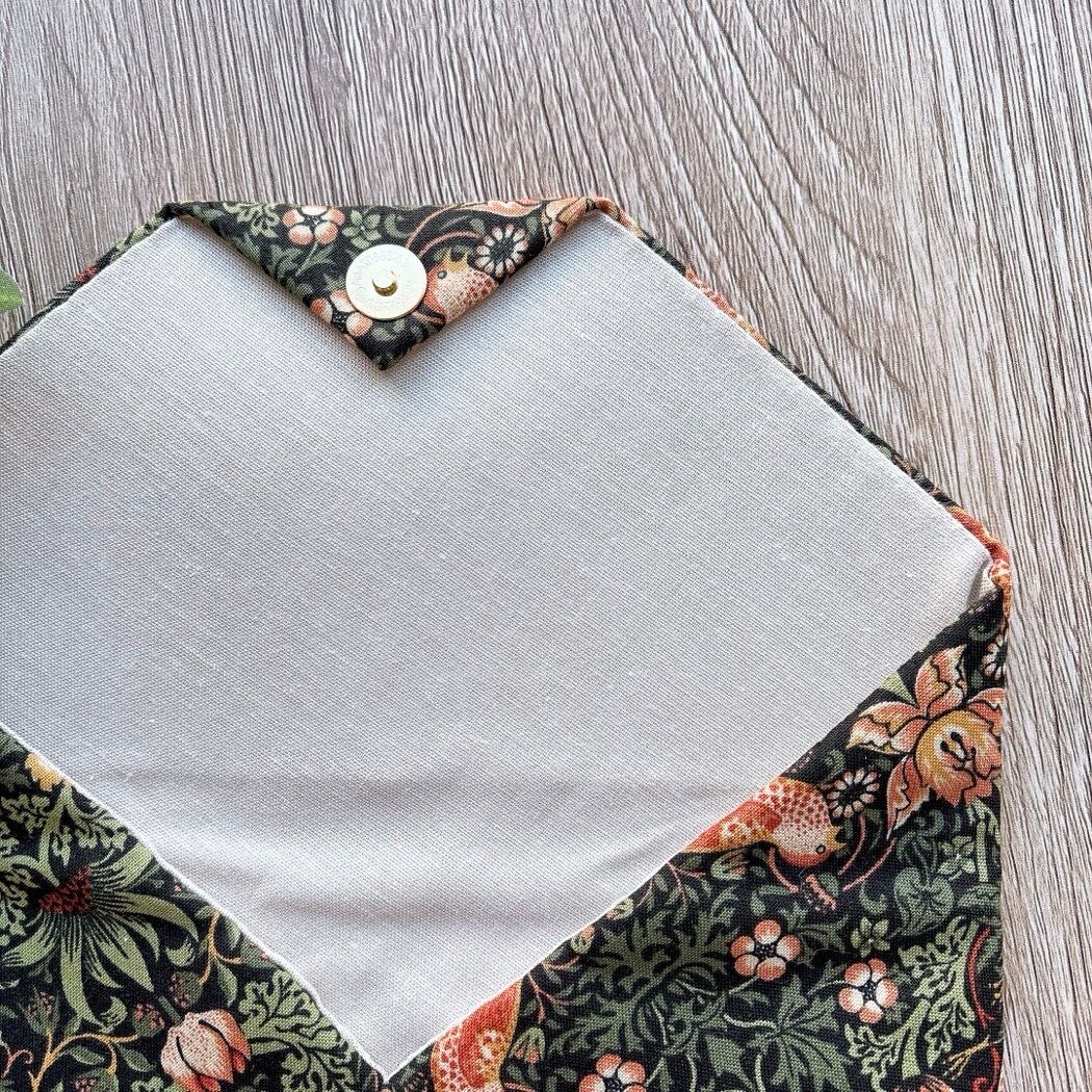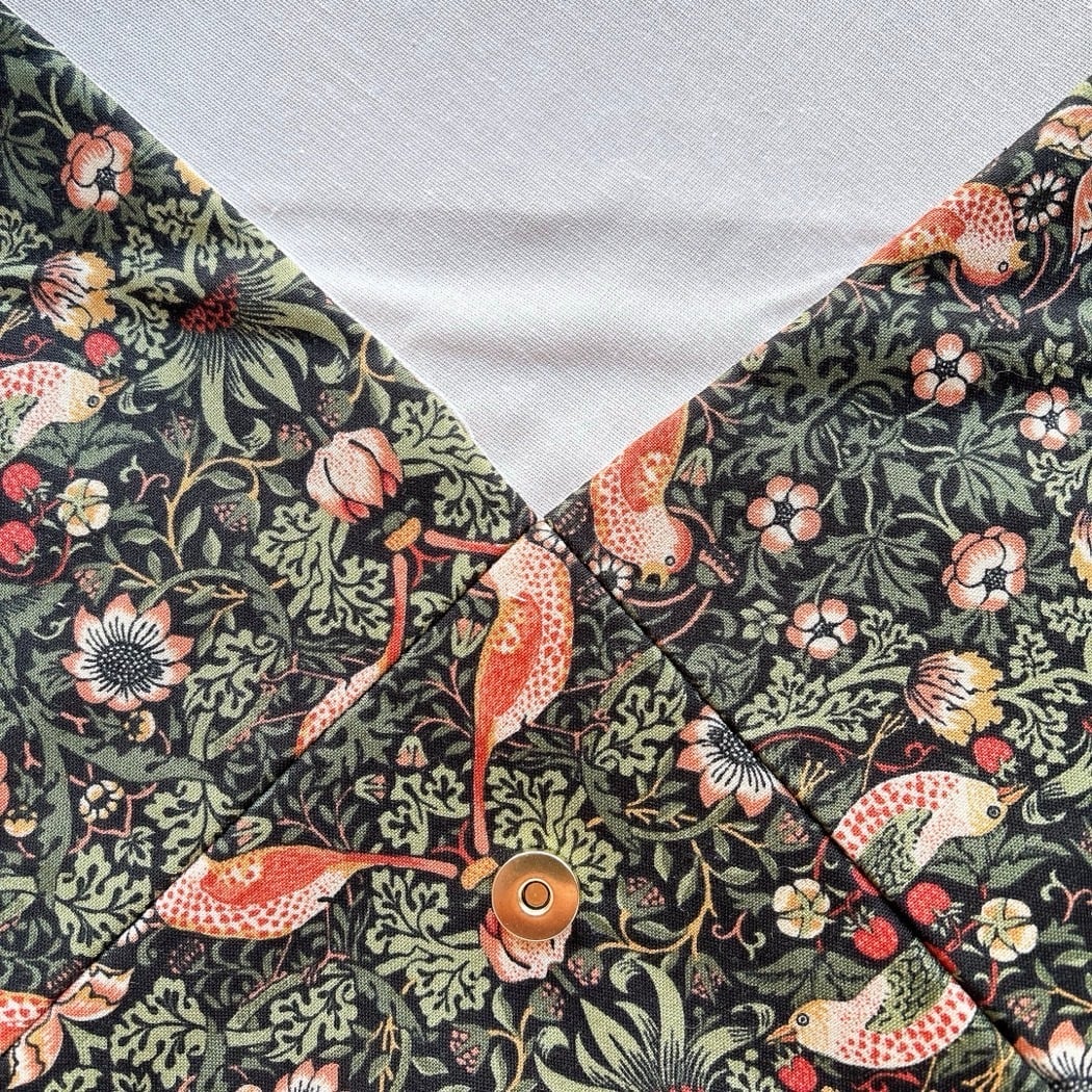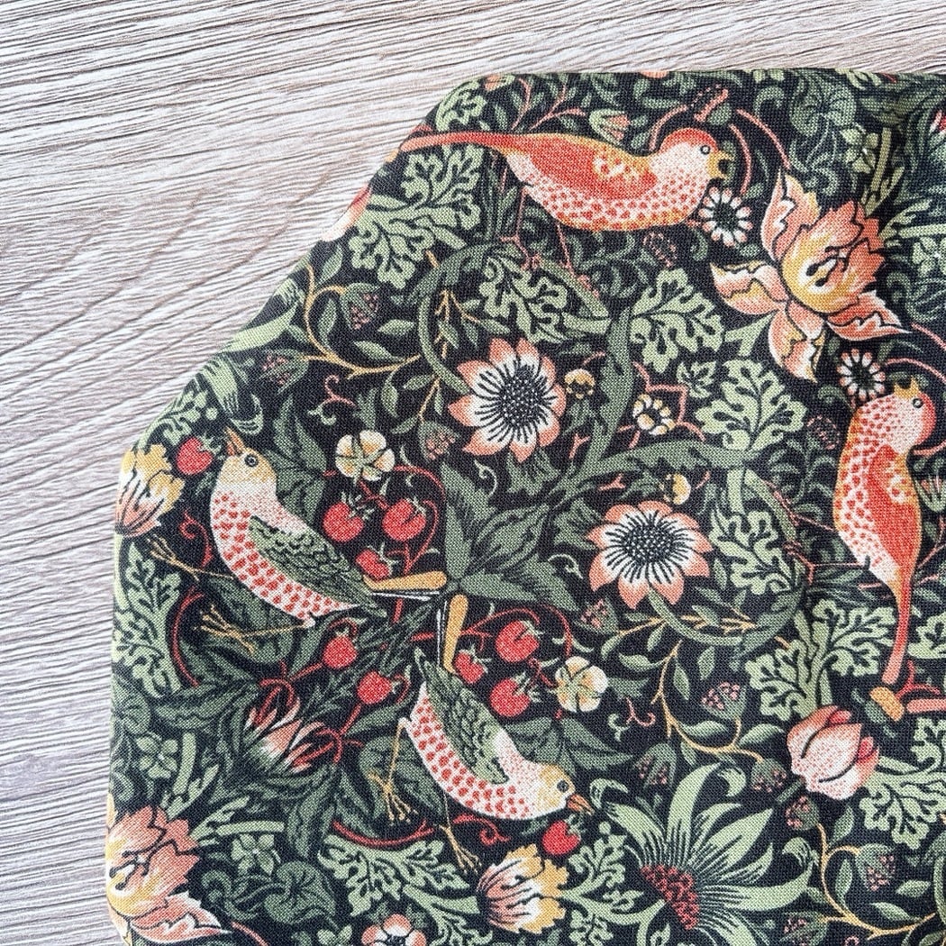 moda fabricsの「William Morris」デザイン生地「いちご泥棒」を使用し、苺をついばむ鳥が描かれた洋風の数寄屋袋に仕上げました。裏地には生成り色のリネンを合わせ、自然で落ち着いた風合いが特徴です。