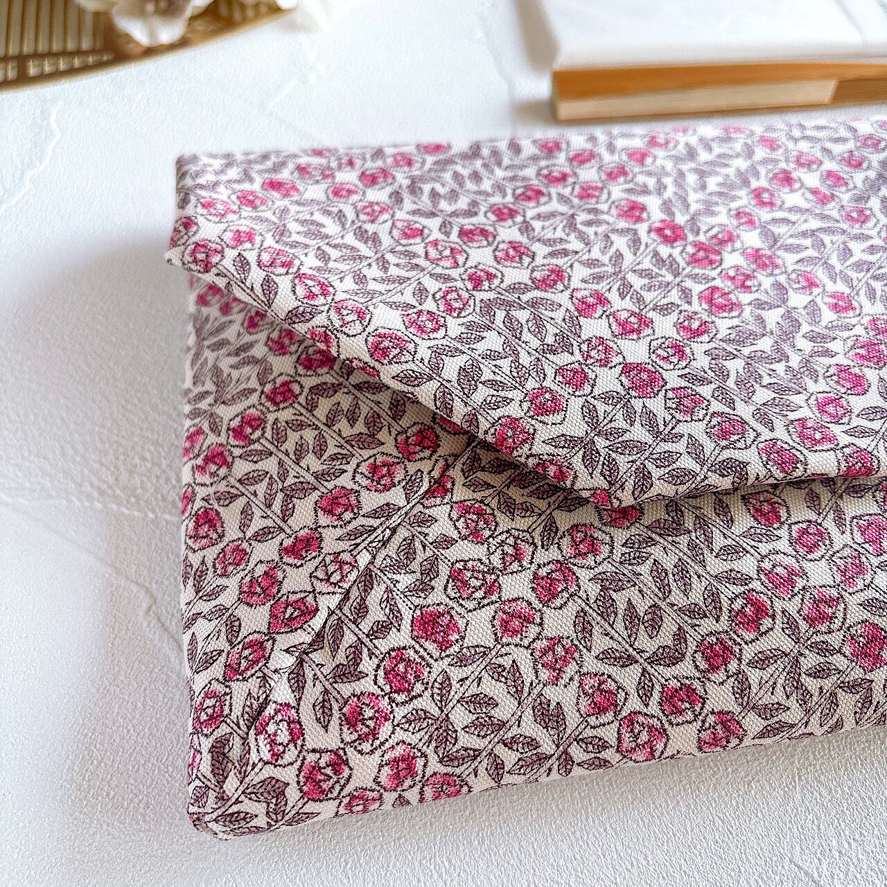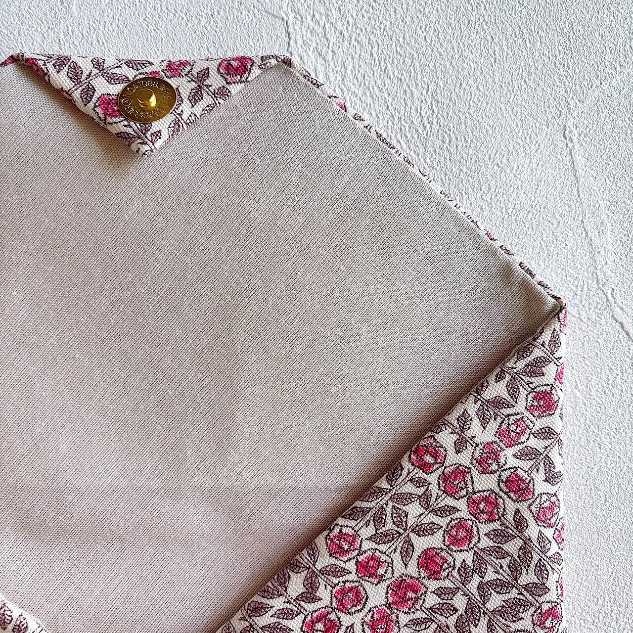 小さなバラのつぼみや葉が幾何学的に繊細に描かれており、デザイン全体がシンプルながらも精密で、クラシックな美しさがあります。内布は生成り色のリネンをあわせています。