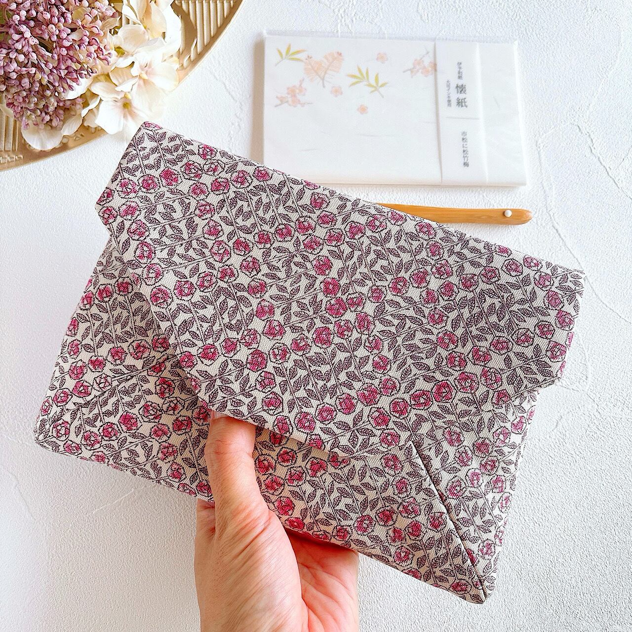 リバティのオックス生地「スリーピングローズ」を使用しておつくりした洋風の数寄屋袋です。
