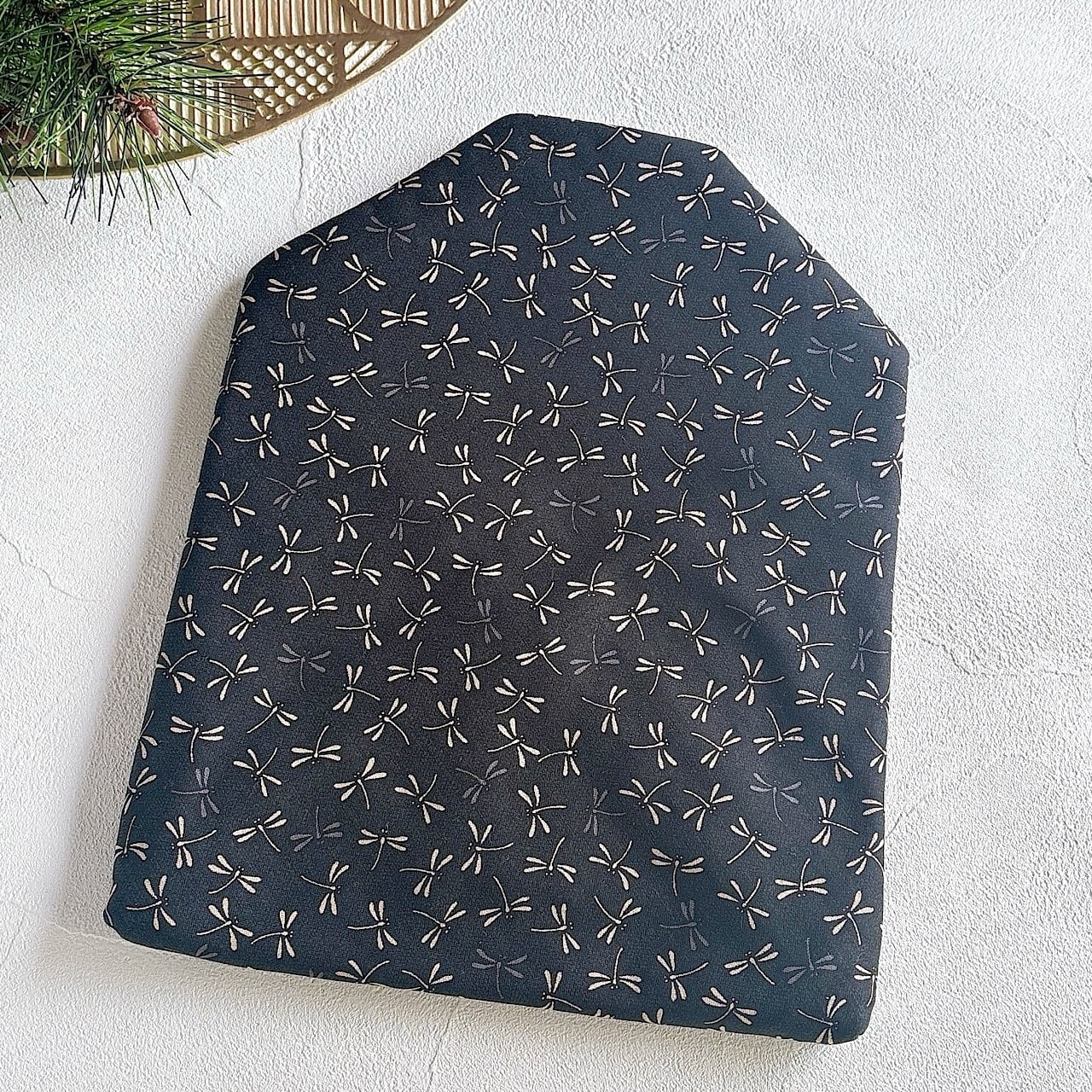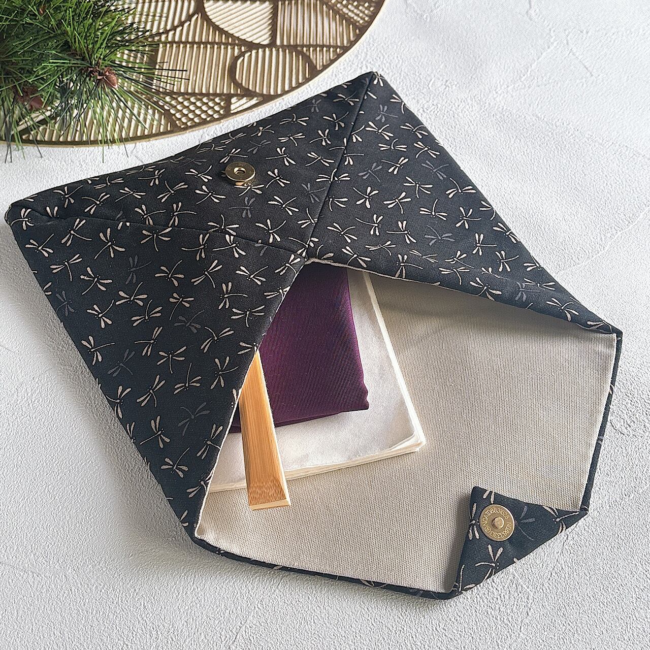 黒地にトンボ柄のコットン生地からおつくりした数寄屋袋です。