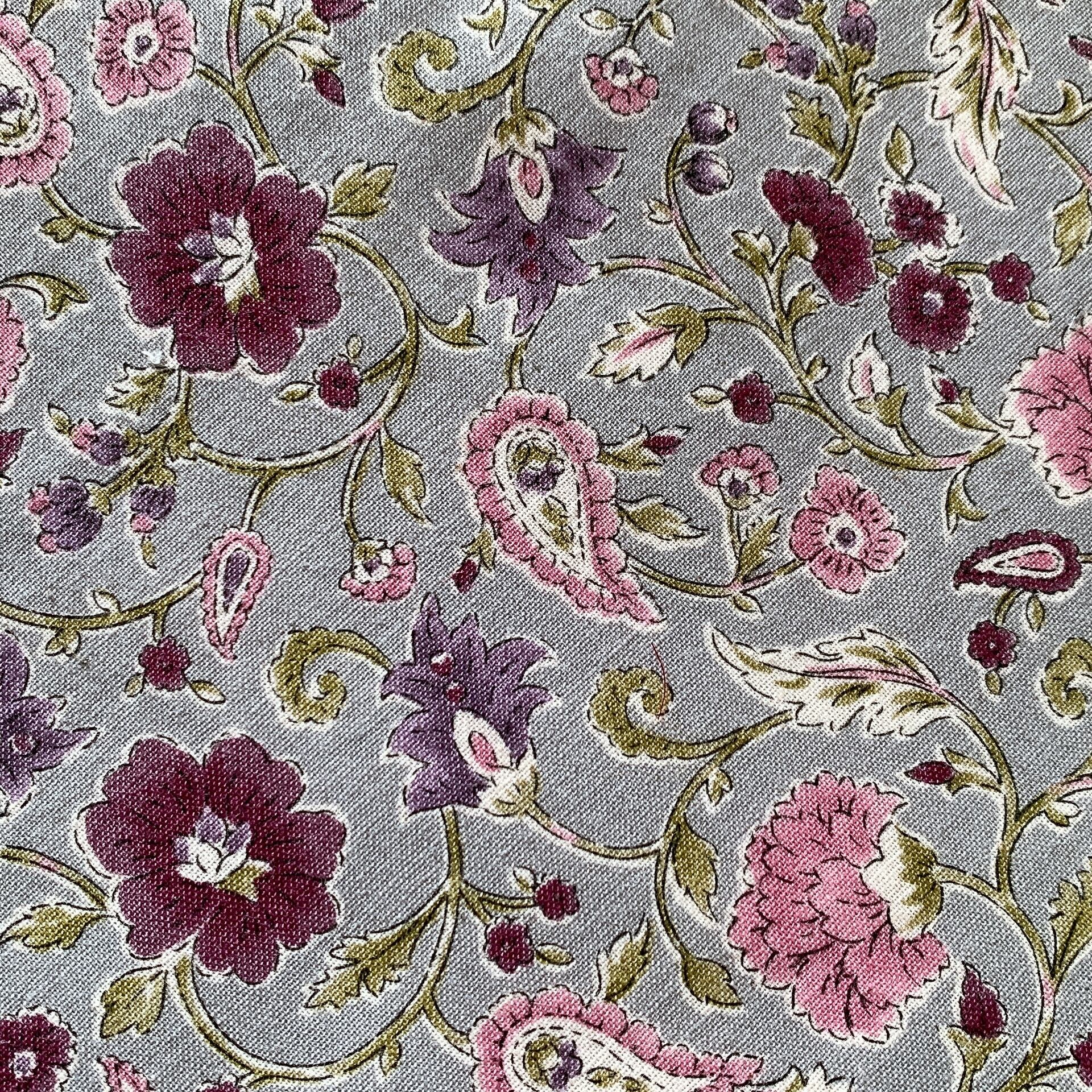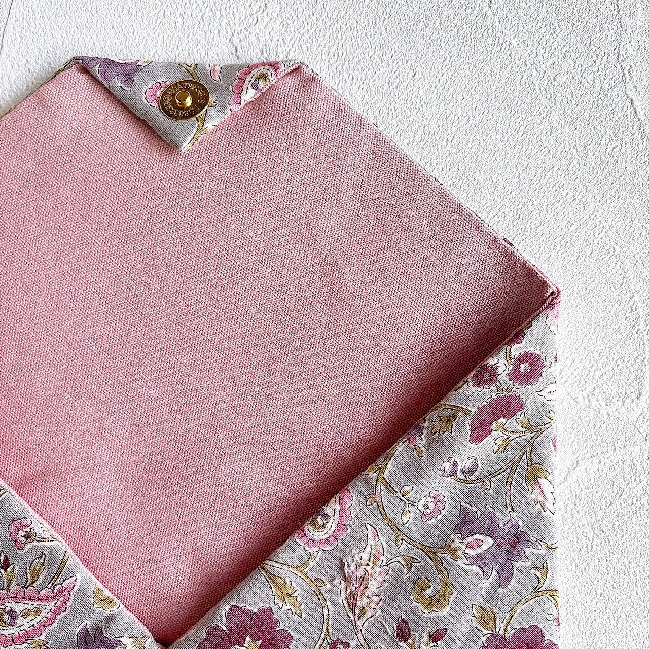 更紗調の綿麻生地から、エレガントな数寄屋袋ができました。裏地はくすみピンクをあわせています。
