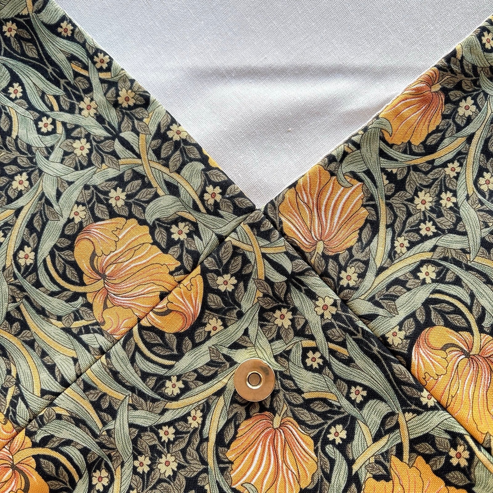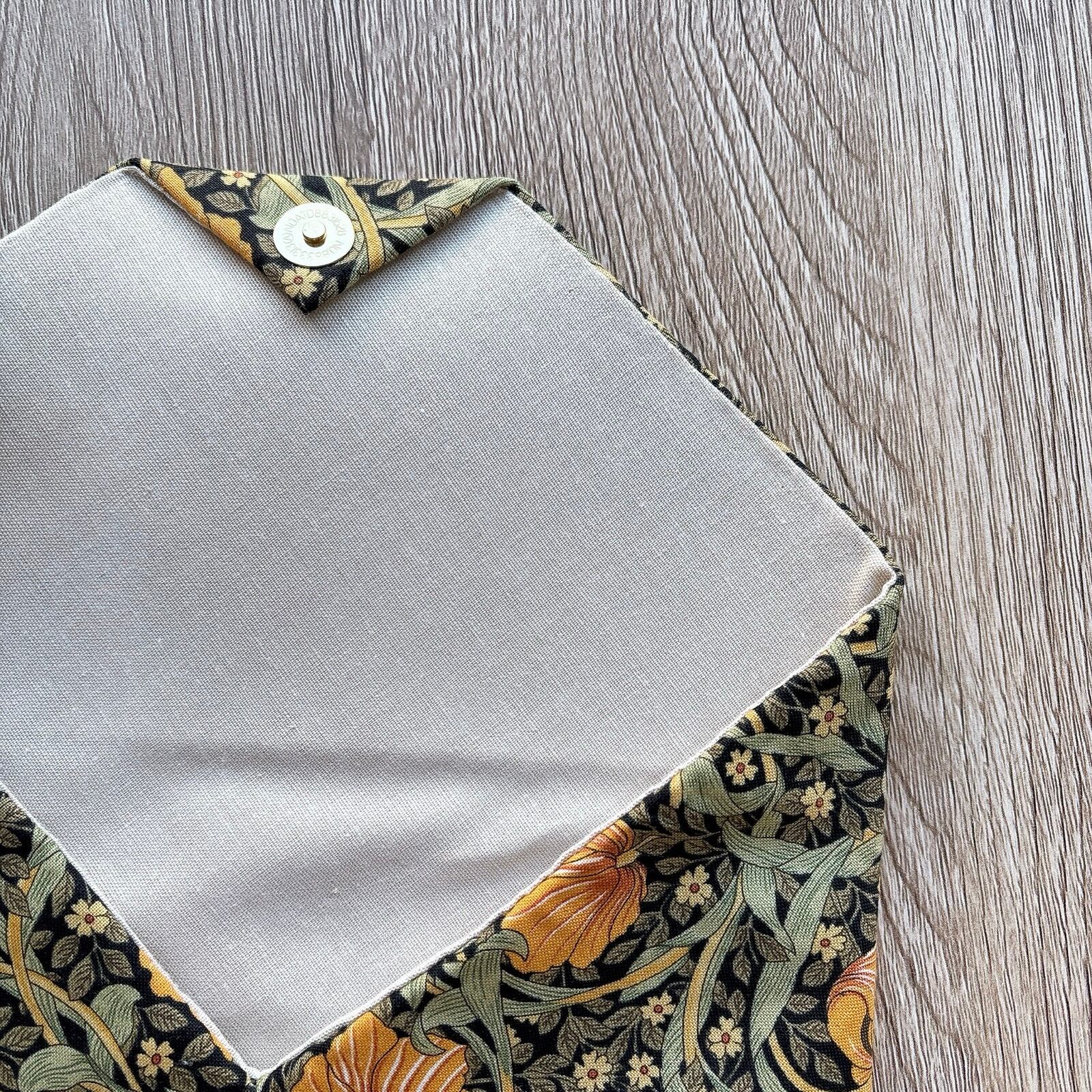 moda fabricsのWilliam Morrisデザインの生地「ピンパネル」を使用しておつくりした洋風の数寄屋袋です。カップ咲きのルリハコベ(ピンパネル)に、伸び伸びと生い繁るグリーンが美しいシンメトリーなデザイン生地。裏地は生成りの綿麻リネンをあわせています。