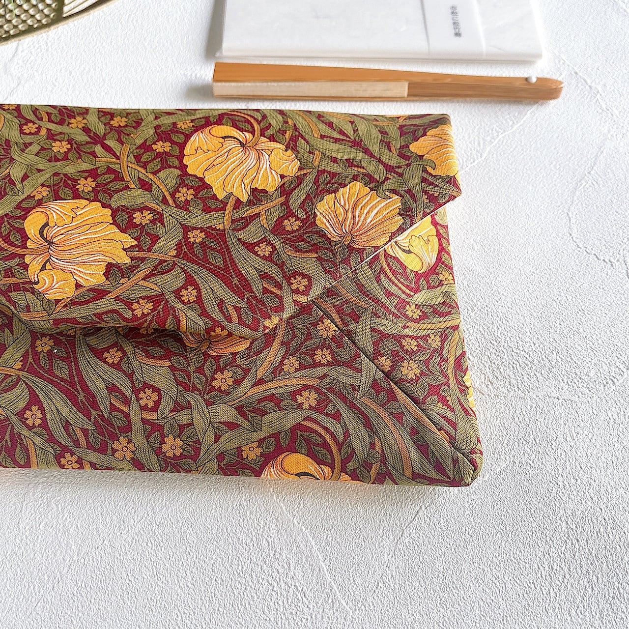 moda fabricsのウィリアム・モリスデザイン生地「ピンパネル」を使用した、エレガントな洋風数寄屋袋です。