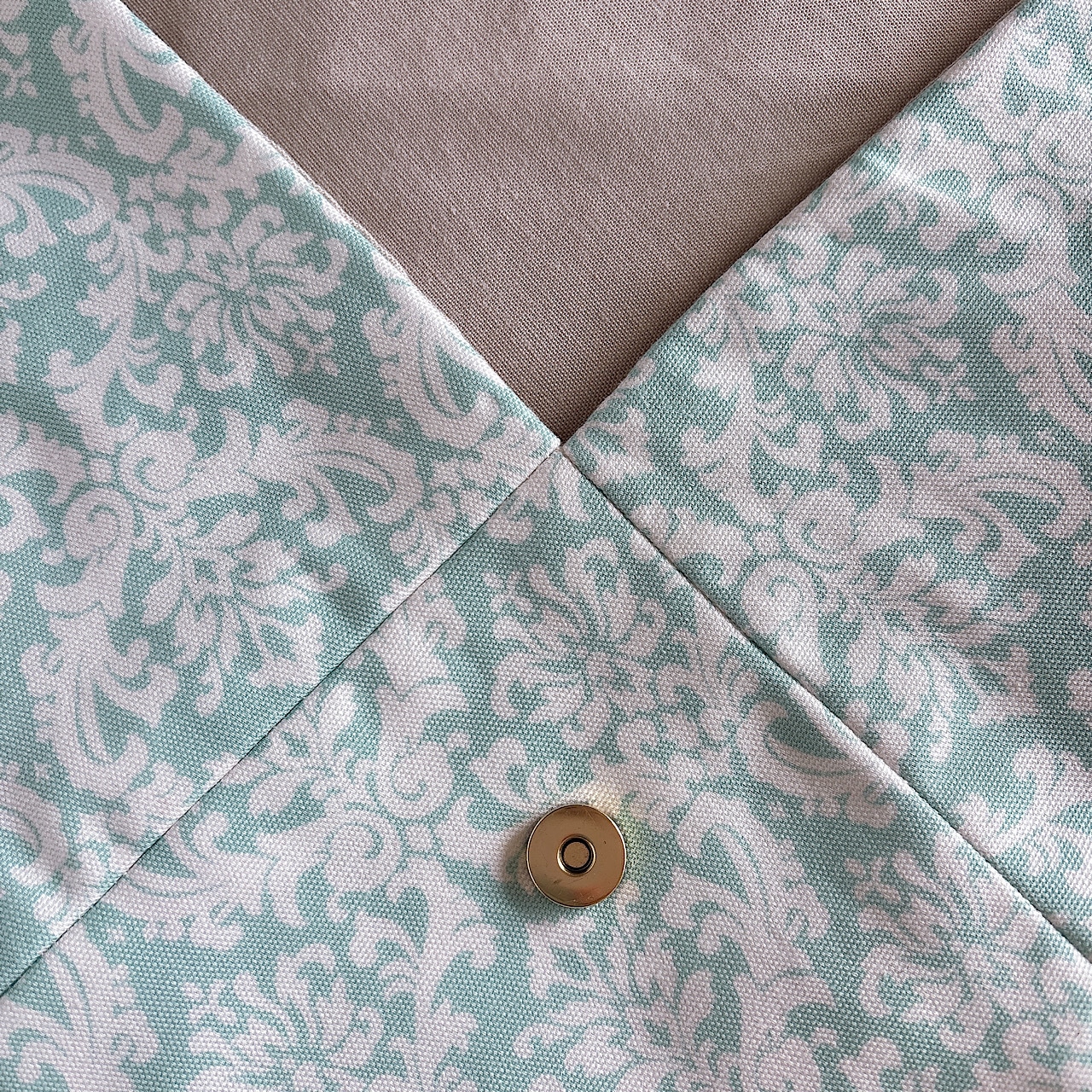パステルミントグリーンとホワイトのダマスク柄が印象的な、優しい雰囲気の数寄屋袋です。