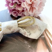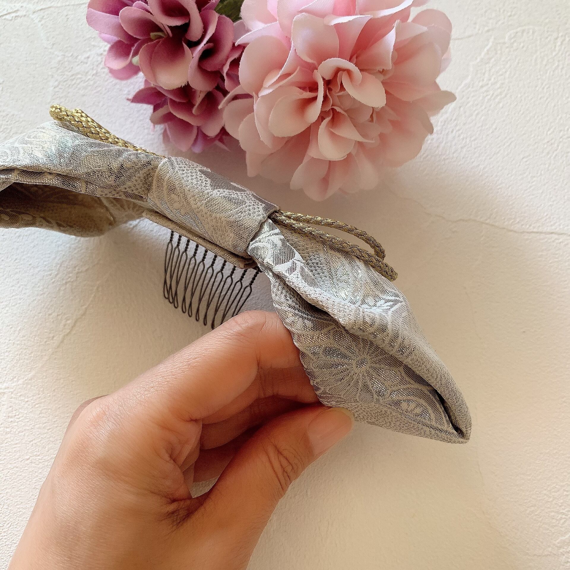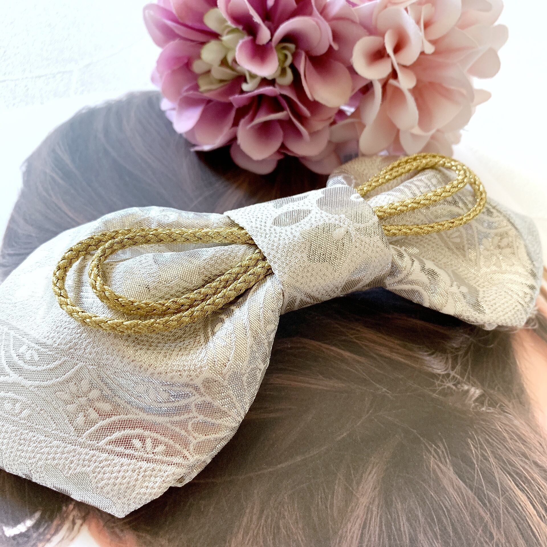 正絹の袋帯(プラチナ箔入り)から仕立てた、華やかで格調あるリボン髪飾りです。